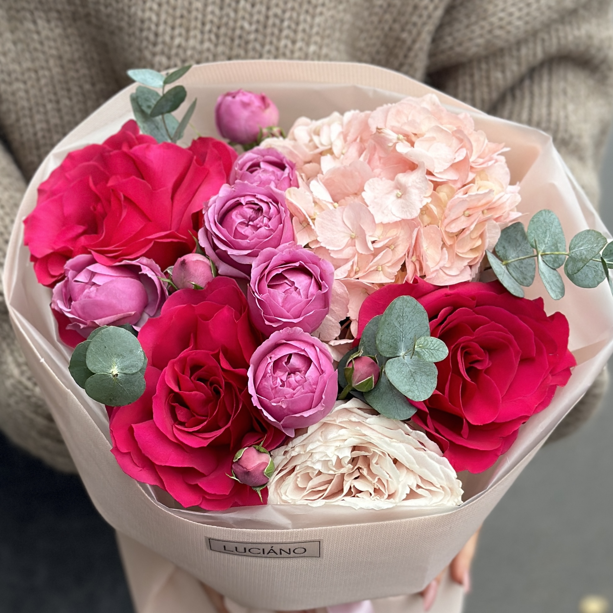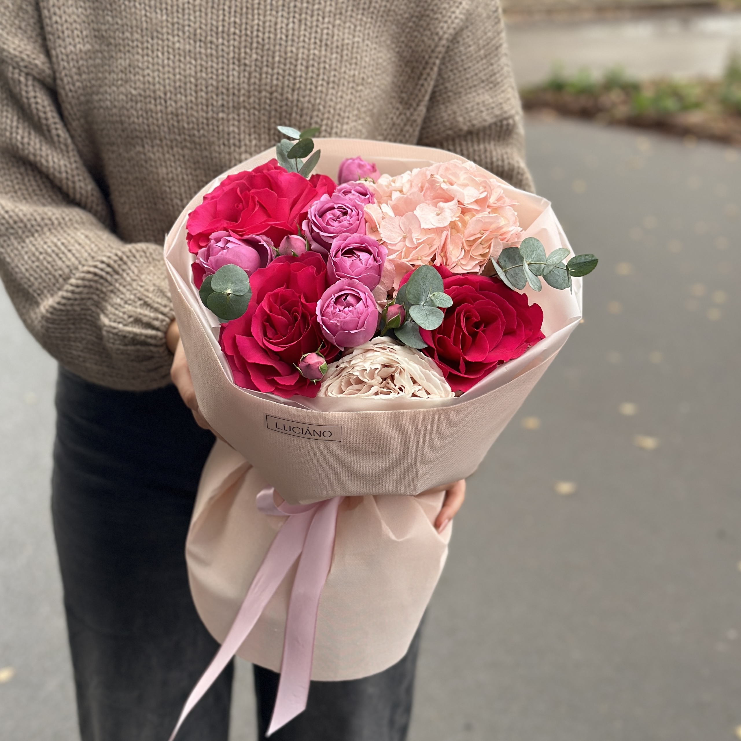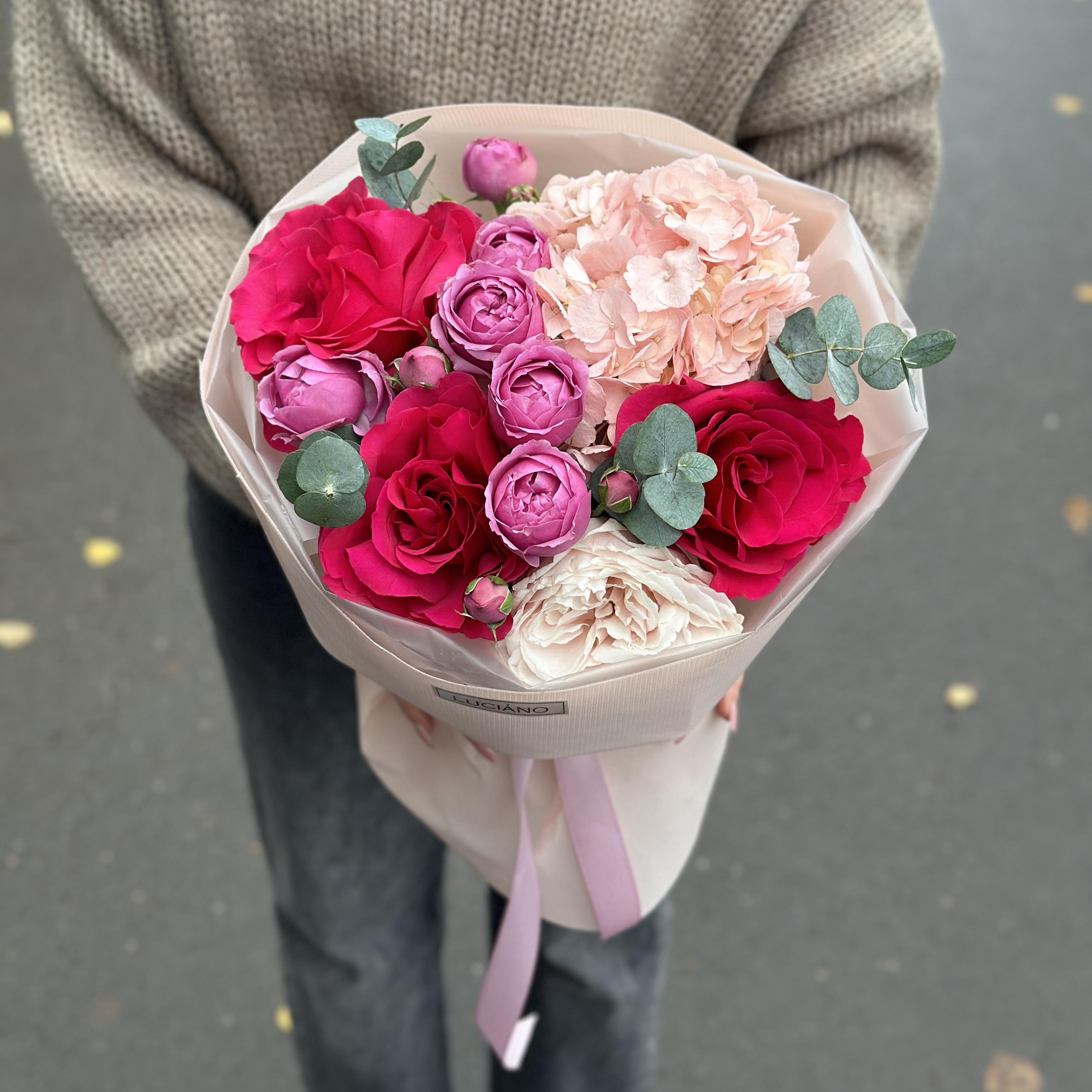Французские розы Gotcha, кустовые розы, роза Tsumugi и гортензия