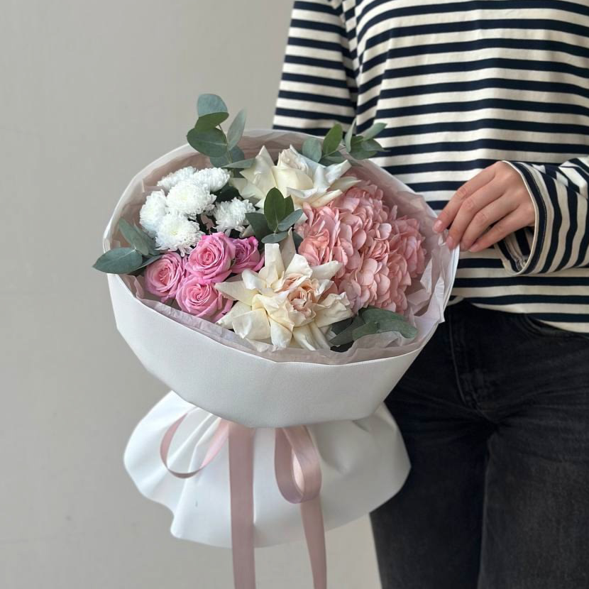 Заказать Авторский букет с кустовыми розами и хризантемой Сантини с доставкой по Самаре