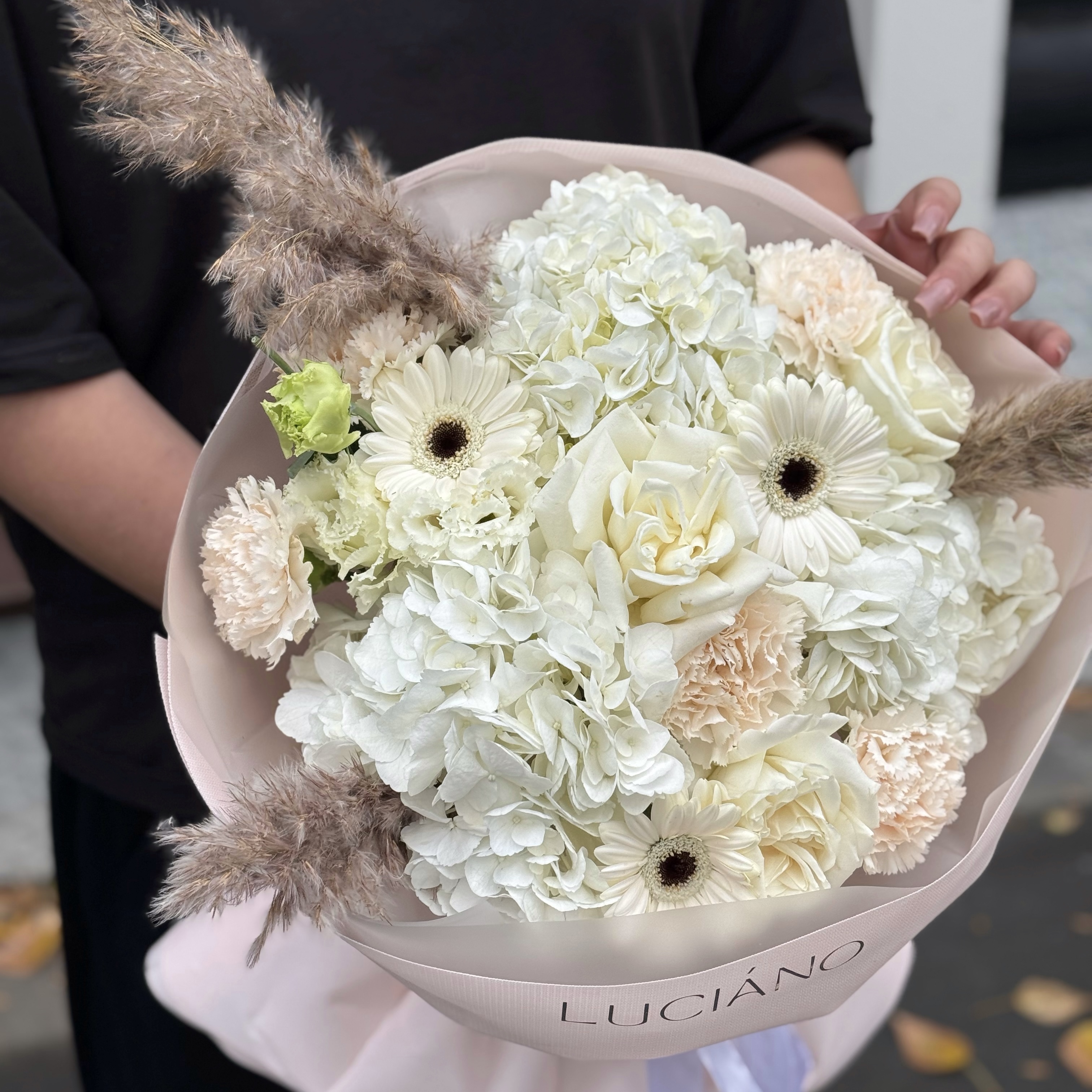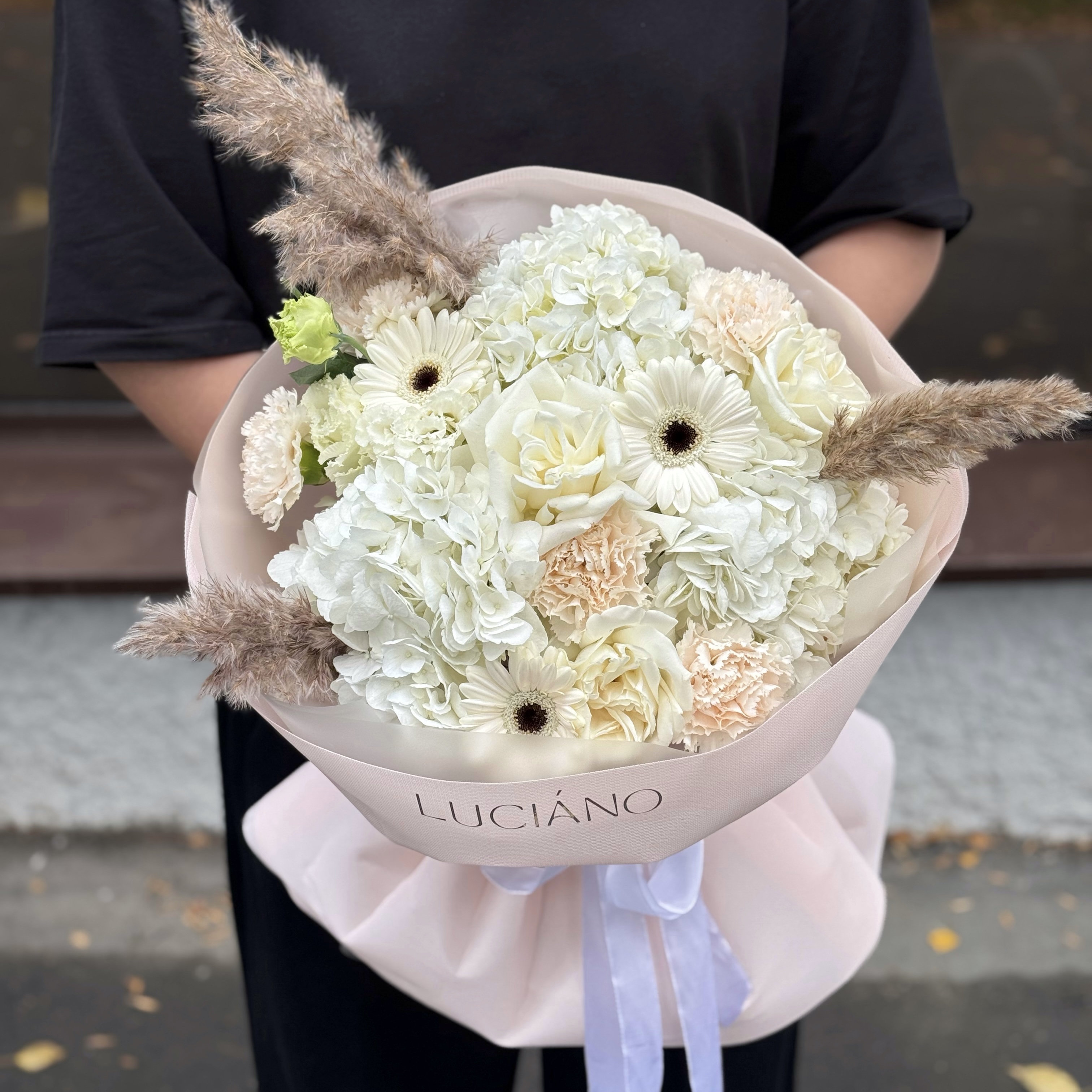 Изысканное сочетание пышной гортензии и воздушных пампасов. Букет, полный света и нежности