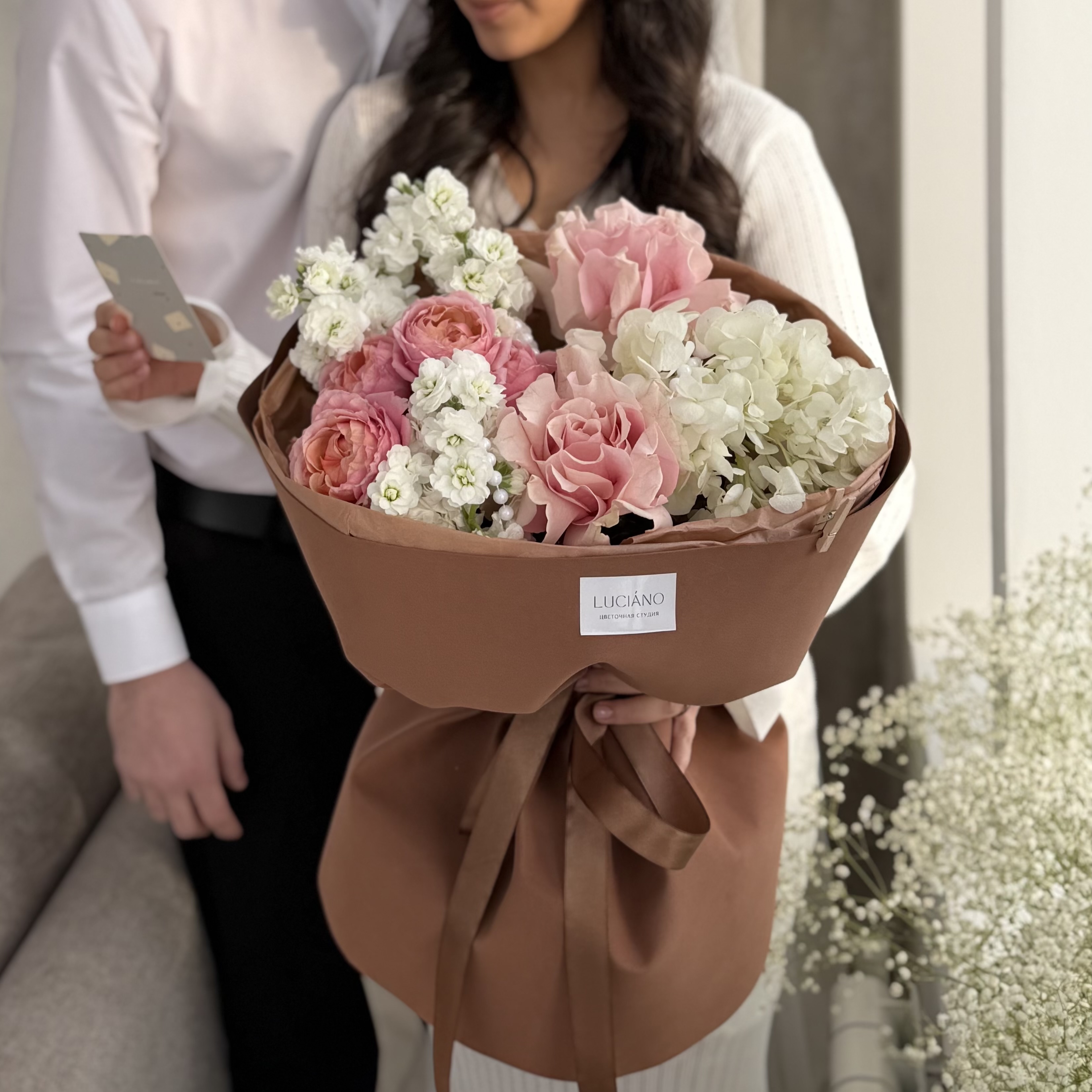 Заказать Авторский букет с кустовыми розами Juliet и маттиолой с доставкой по Самаре