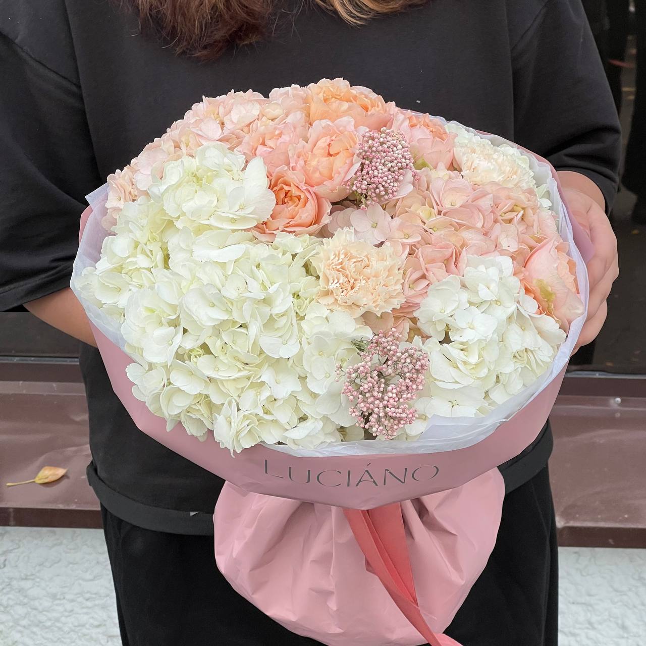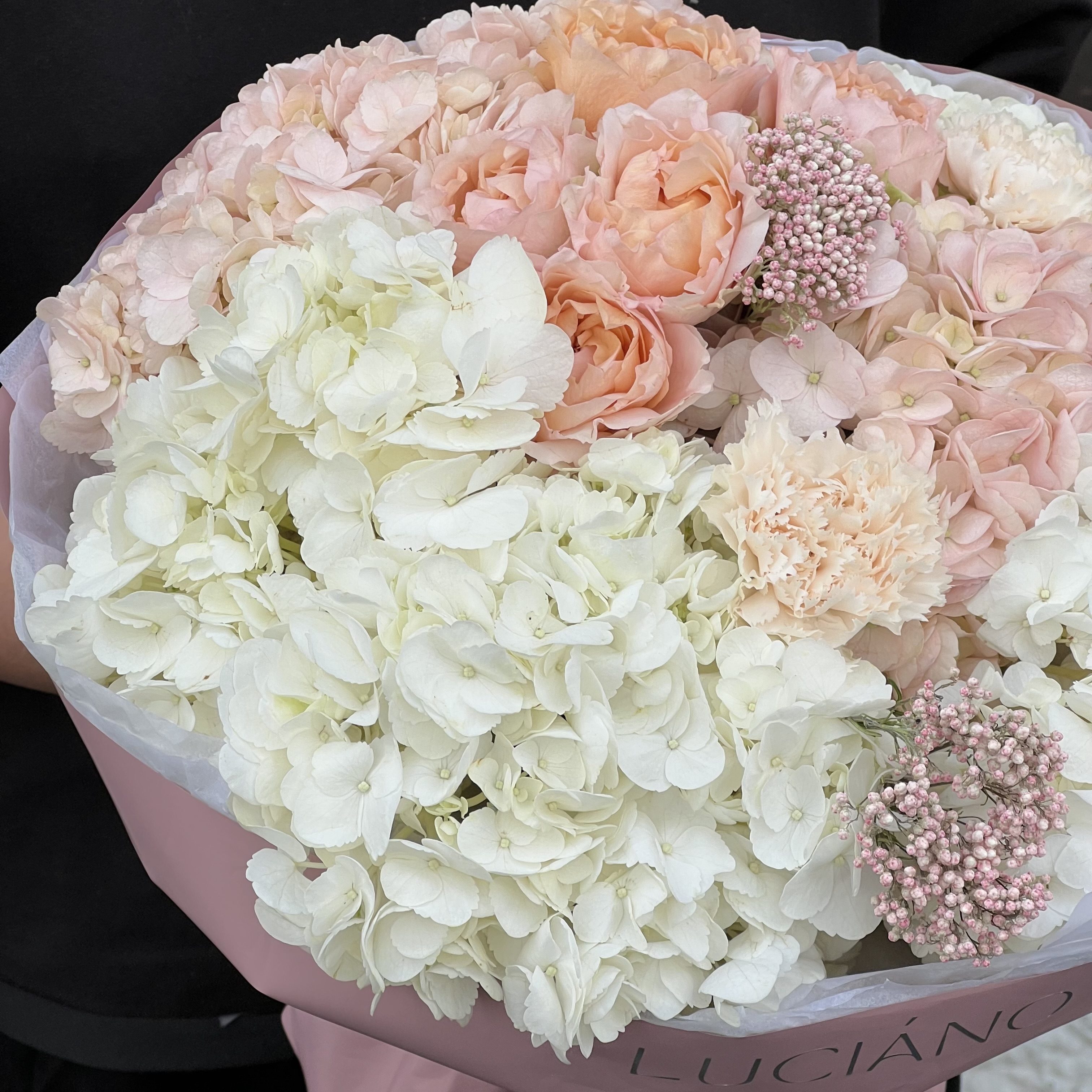 Авторский букет, где нежность встречается с изяществом. Пышная пионовидная роза «Джульетта» с её шелковистыми лепестками дополнена воздушным кружевом озотамнуса.