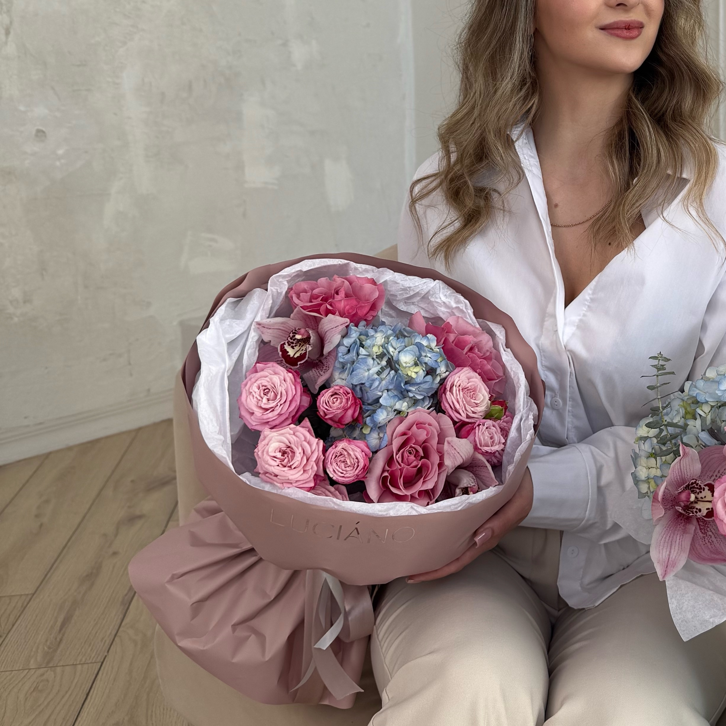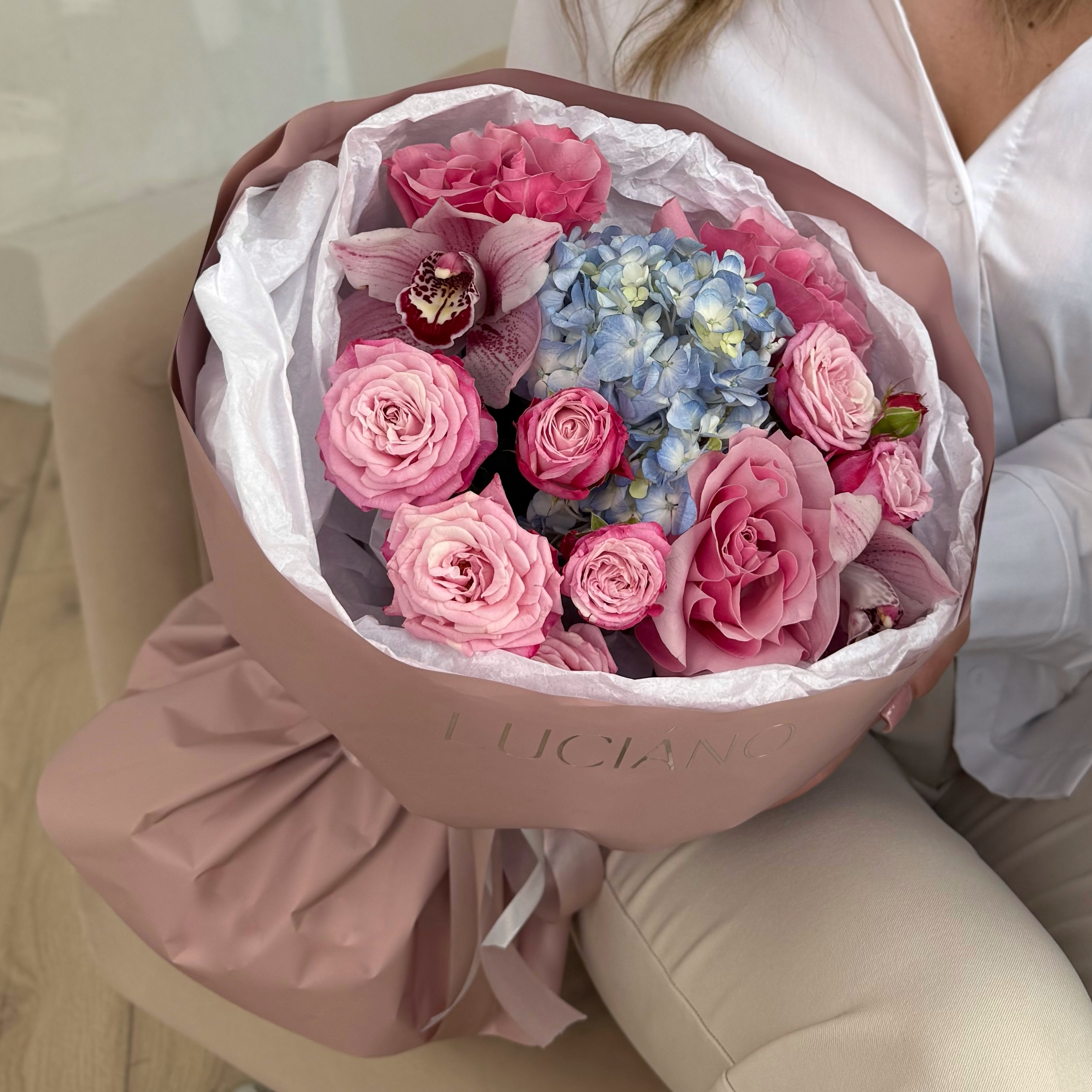 Авторский букет в малиново-голубой цветовой гамме с добавлением орхидеи идеально подходит для любителей креативных сочетаний