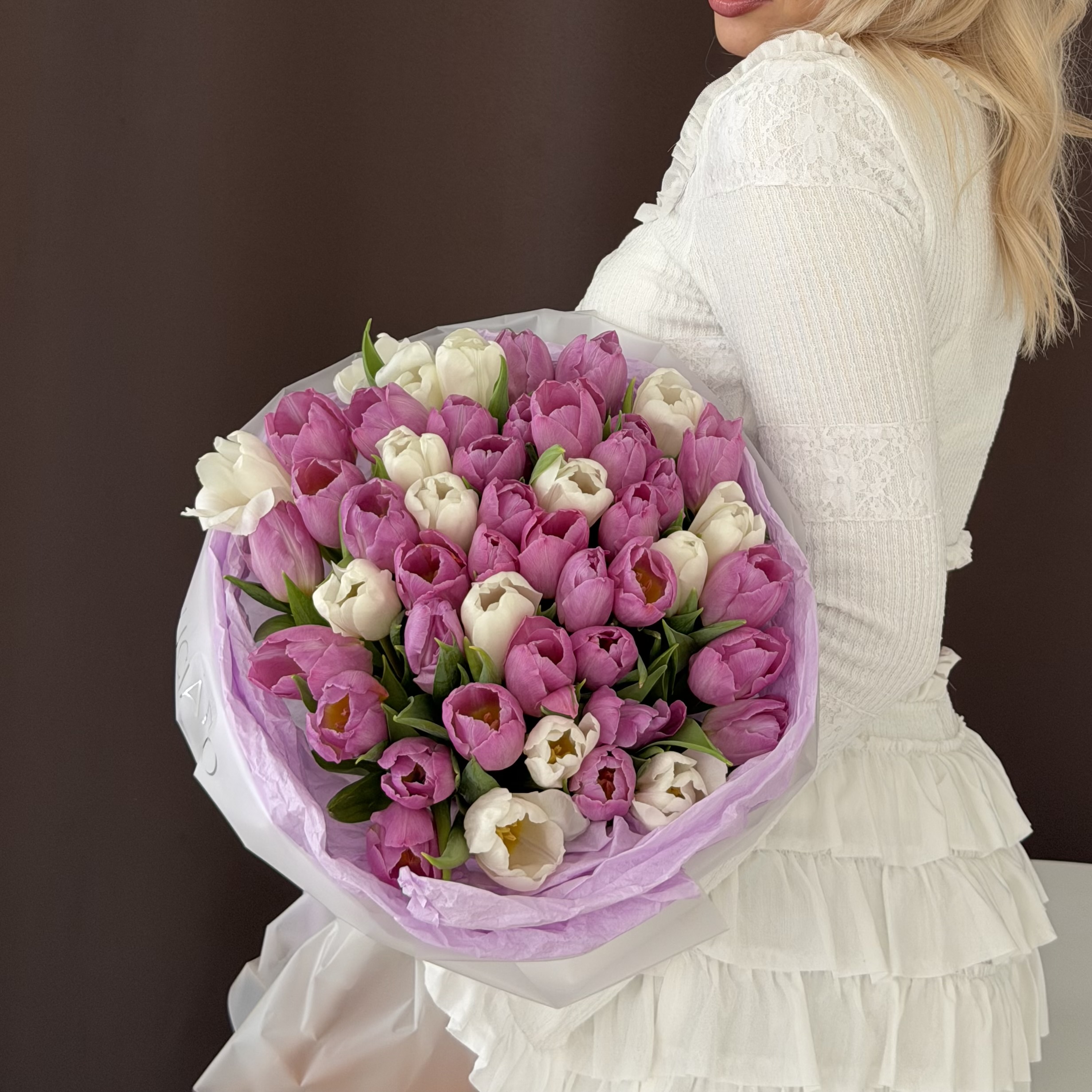 Заказать Моно-букет из белых и фиолетовых тюльпанов - 51 шт с доставкой по Самаре