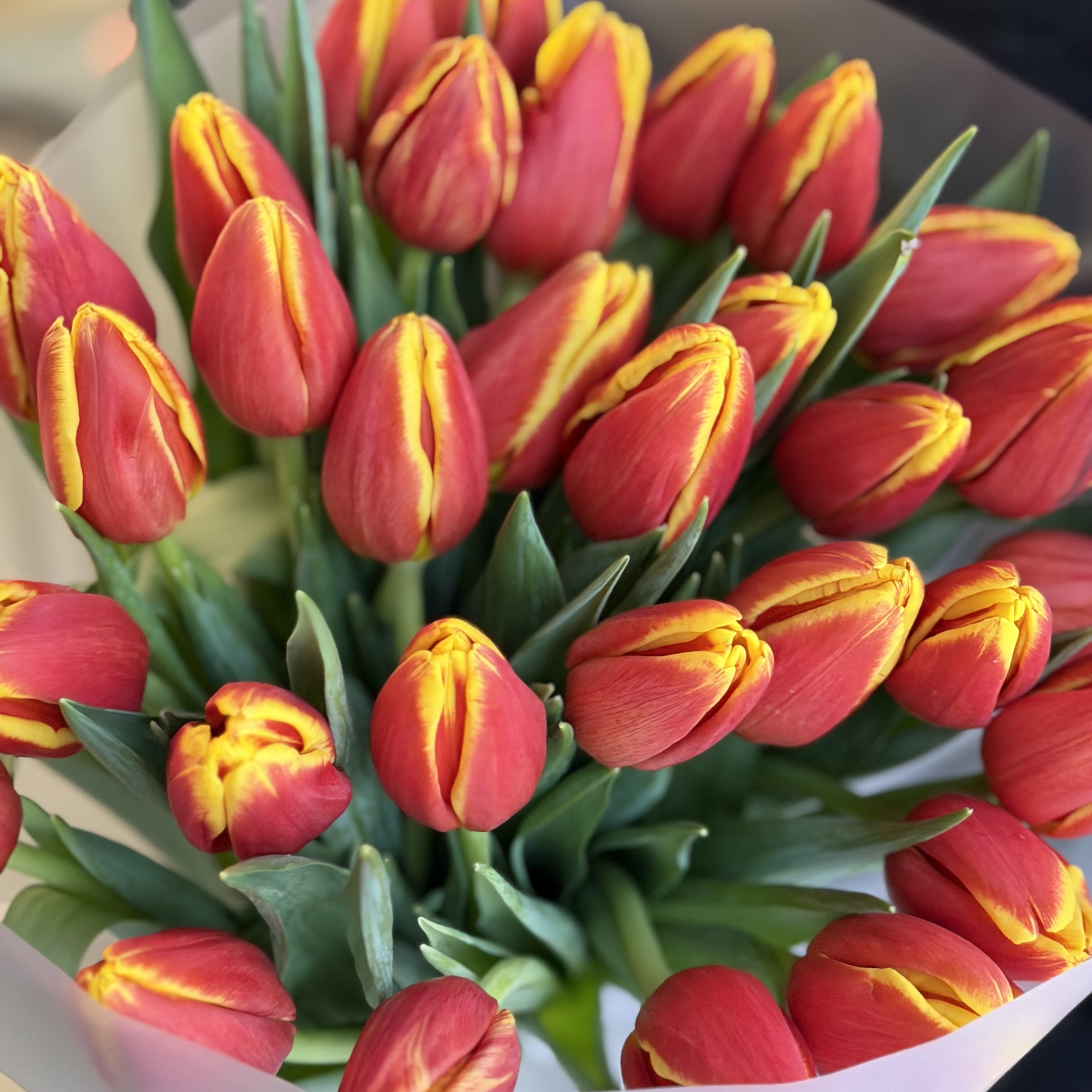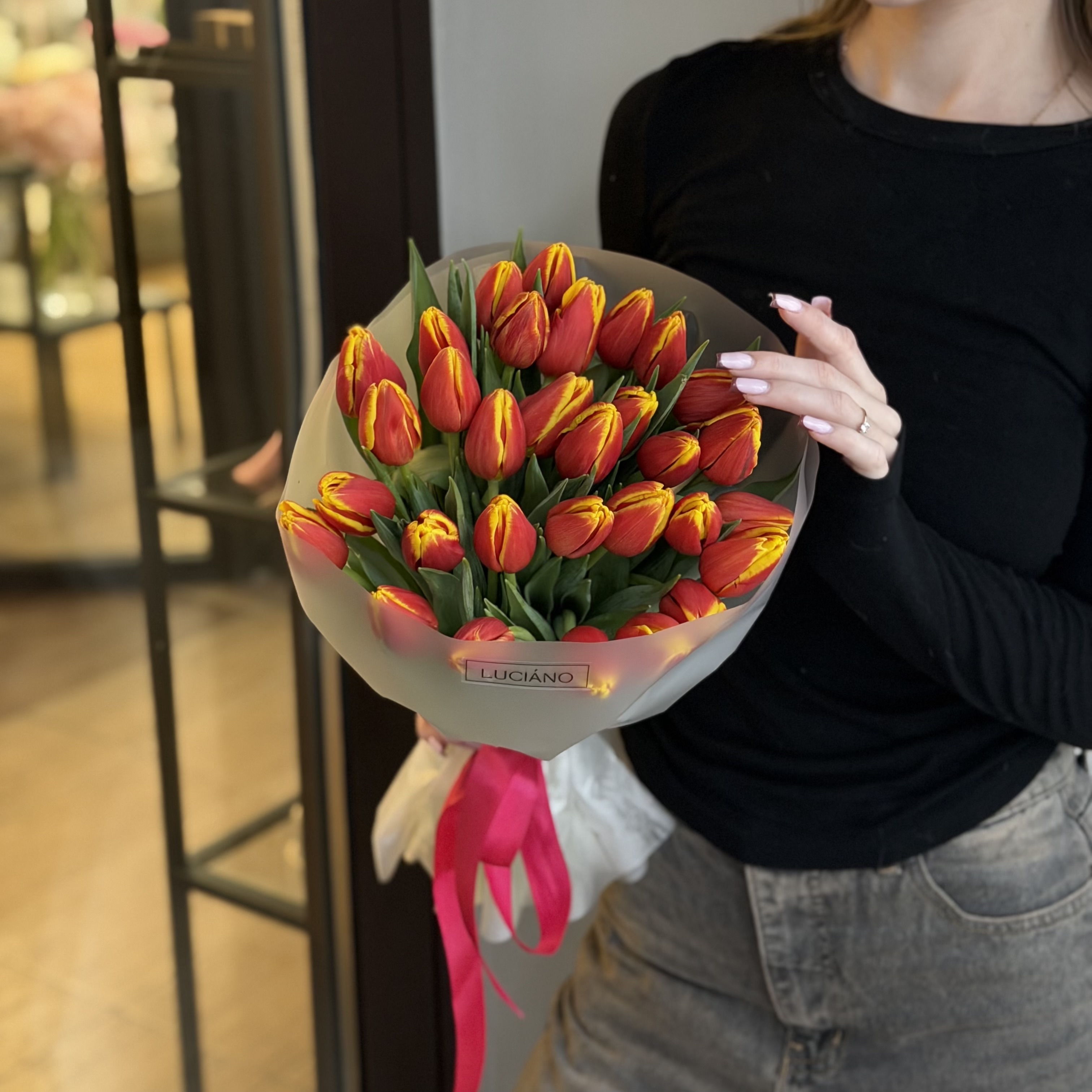 Заказать Моно-букет из красно-желтых тюльпанов - 31 шт с доставкой по Самаре