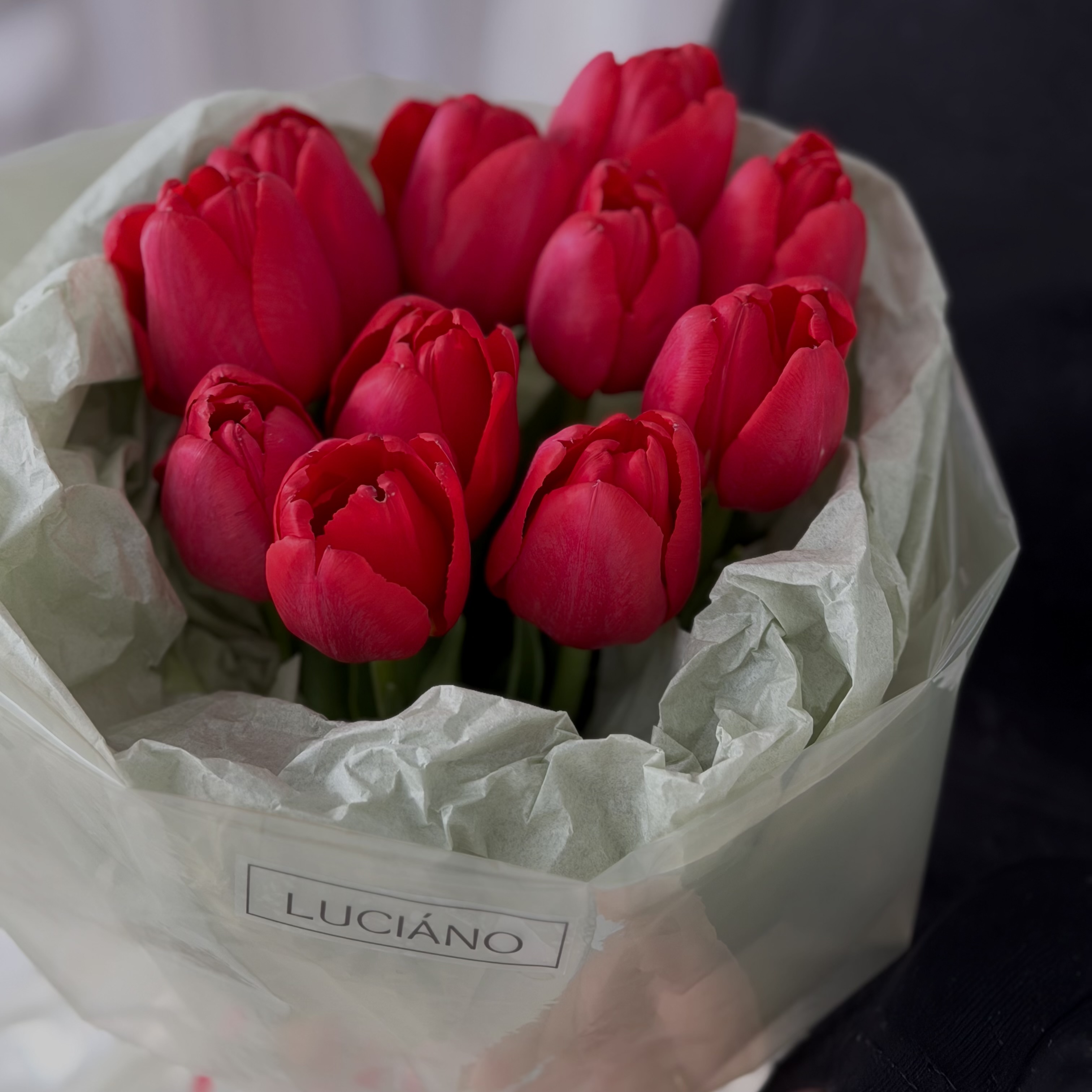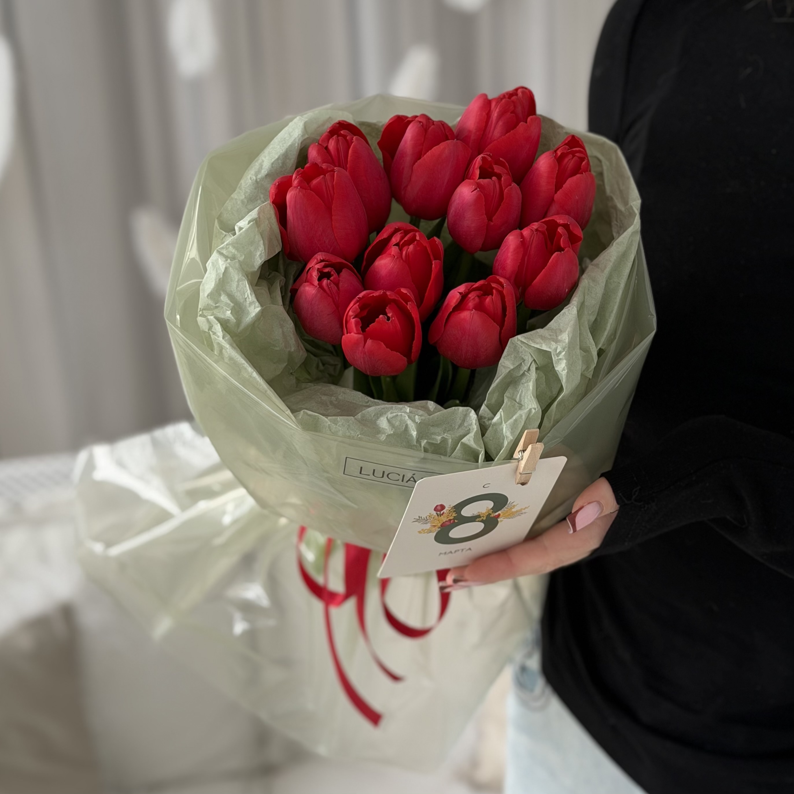 Небольшой букет алых тюльпанов – идеальный подарок для приближающейся весны