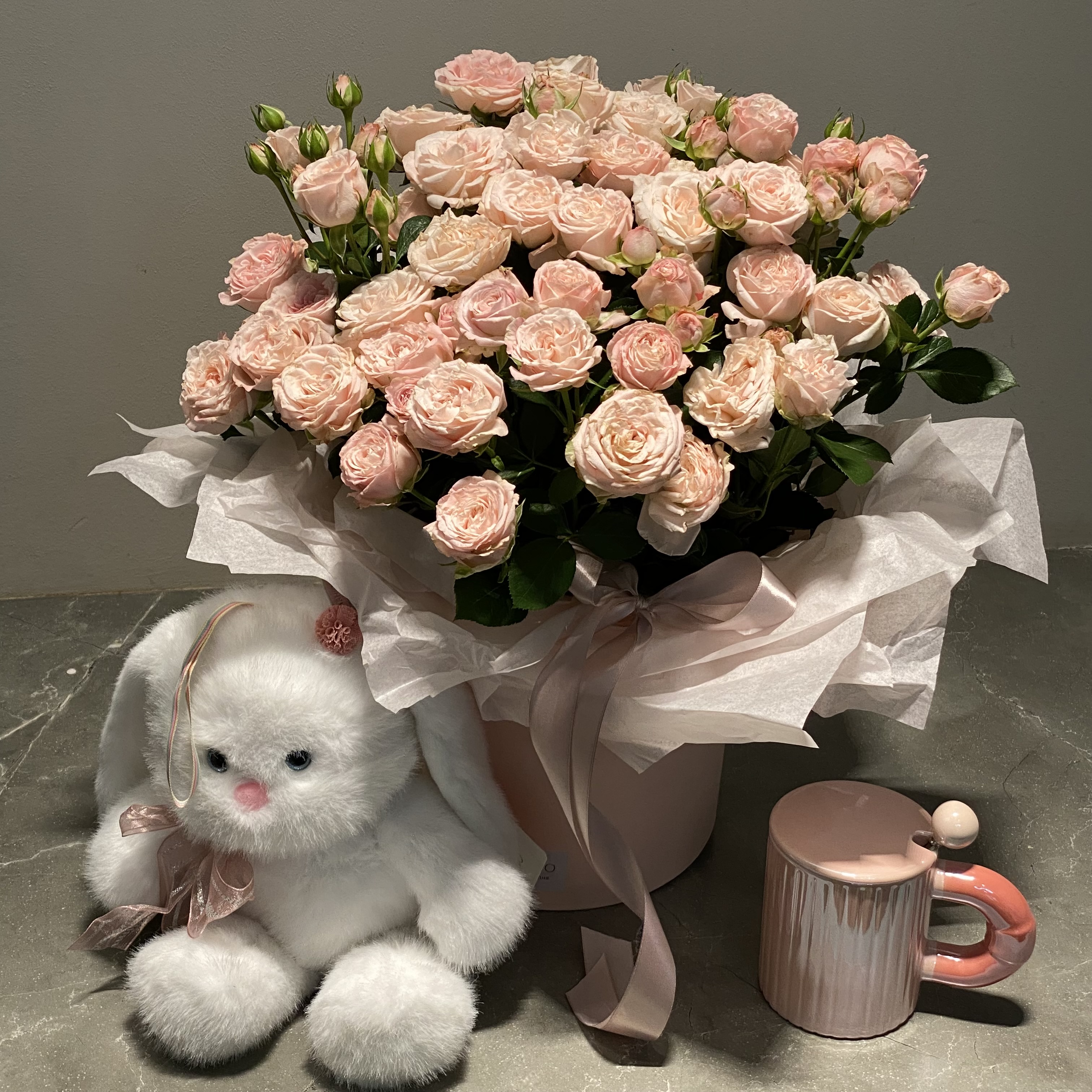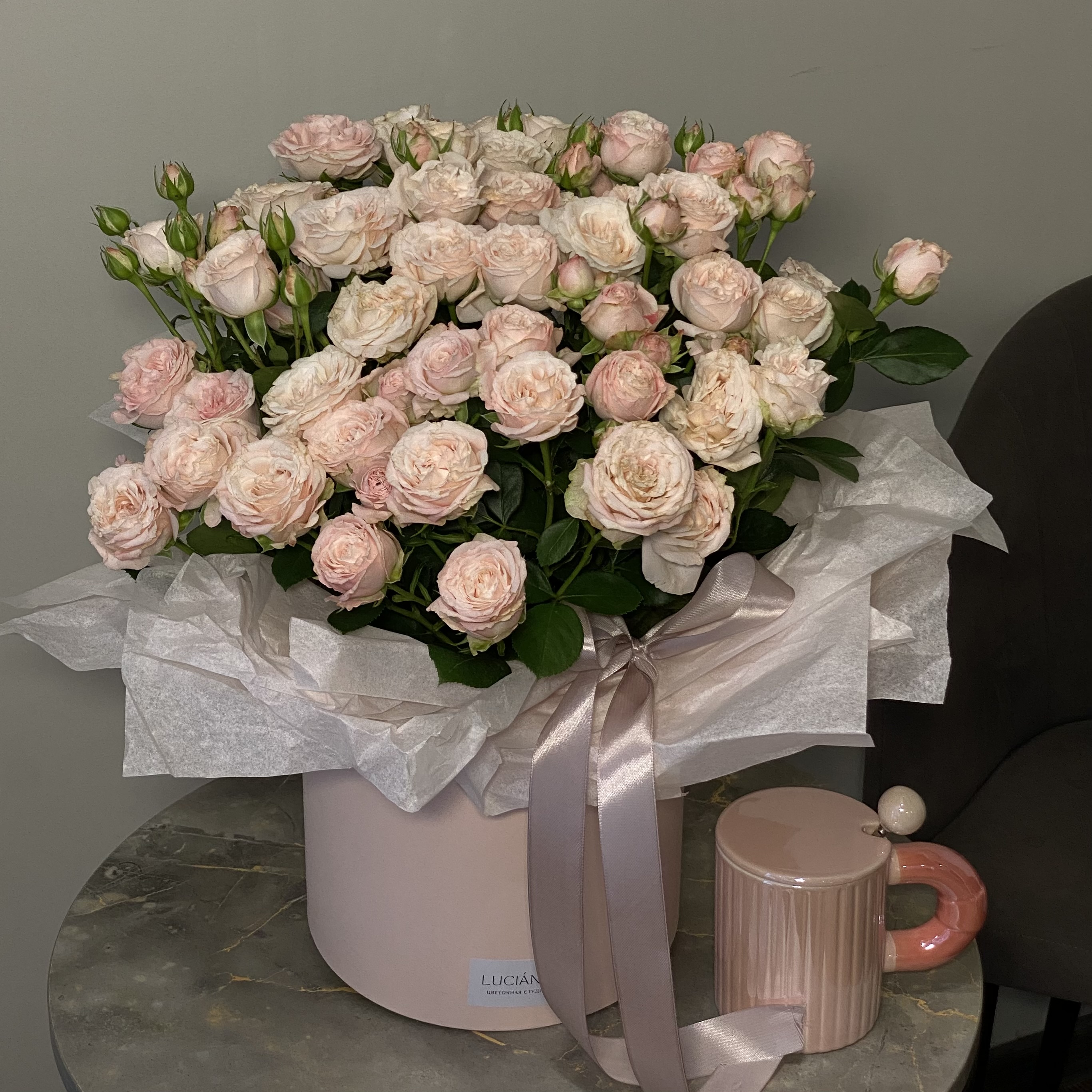 Композиция из пышных кустовых роз в нежном исполнении