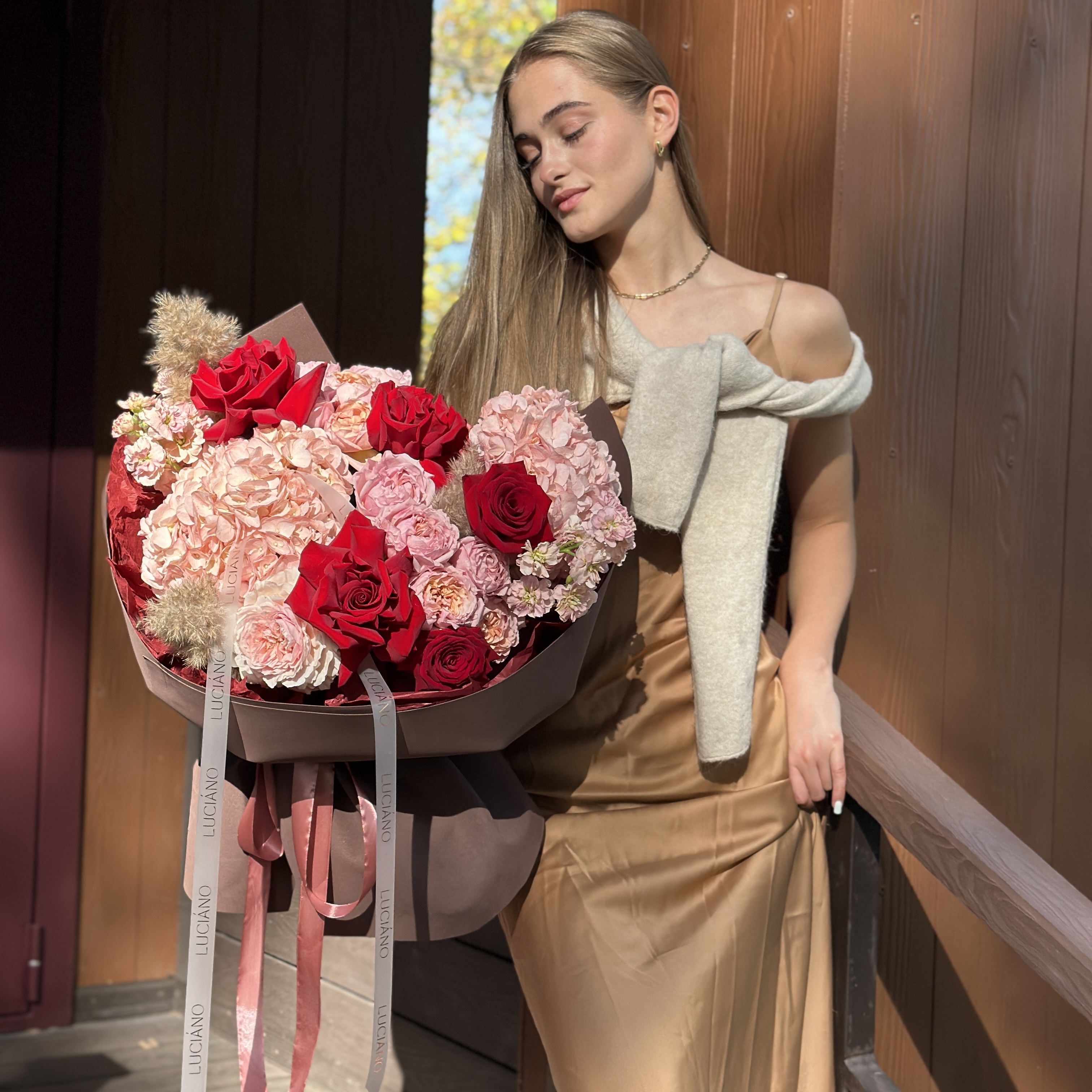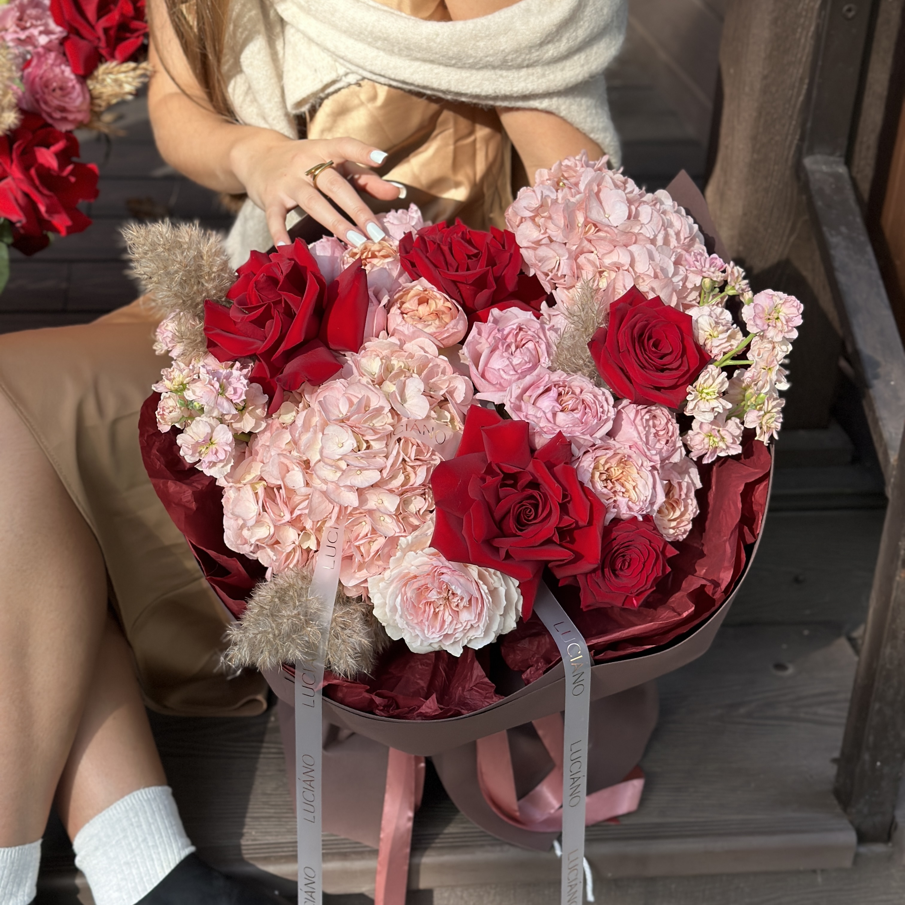 Осенний авторский букет с французскими красными розами Explorer и пампасом