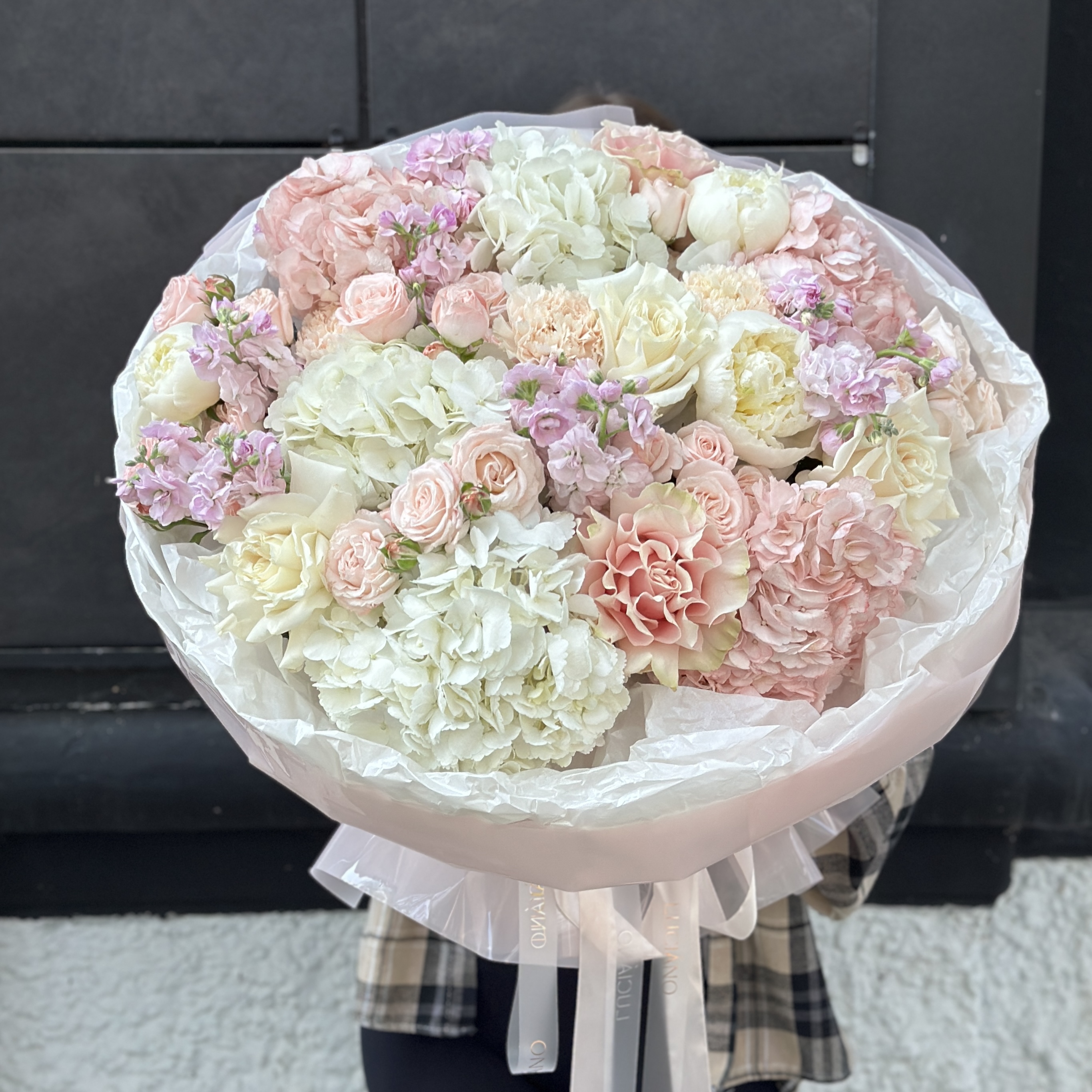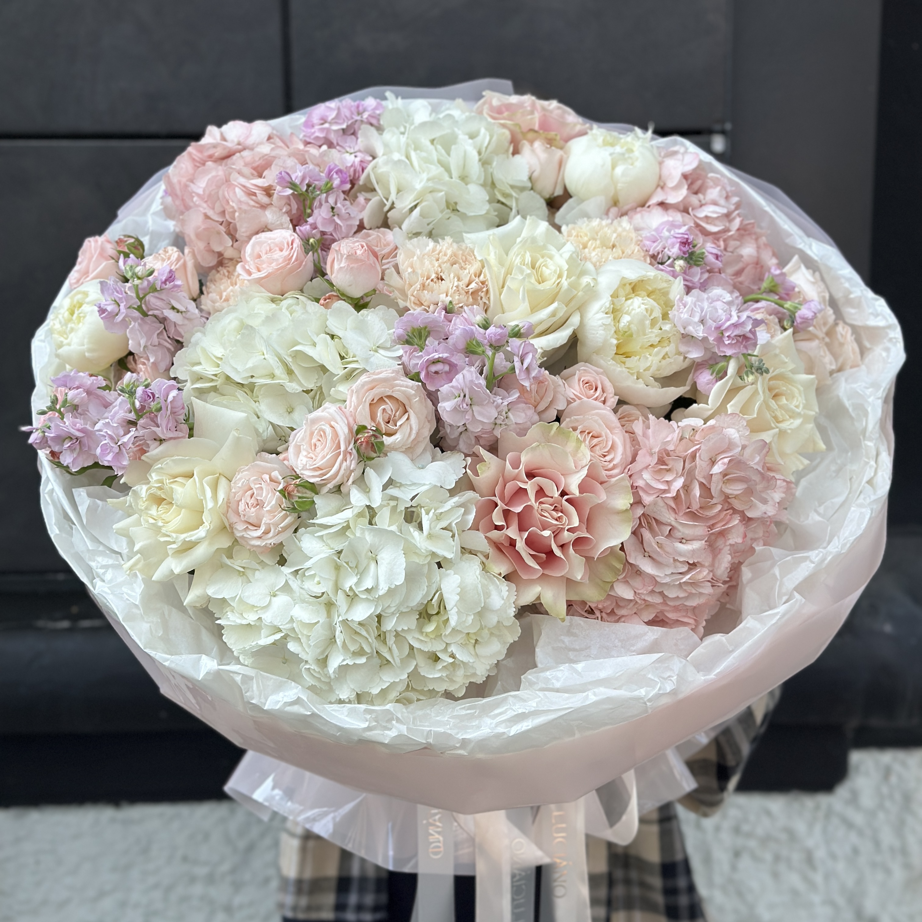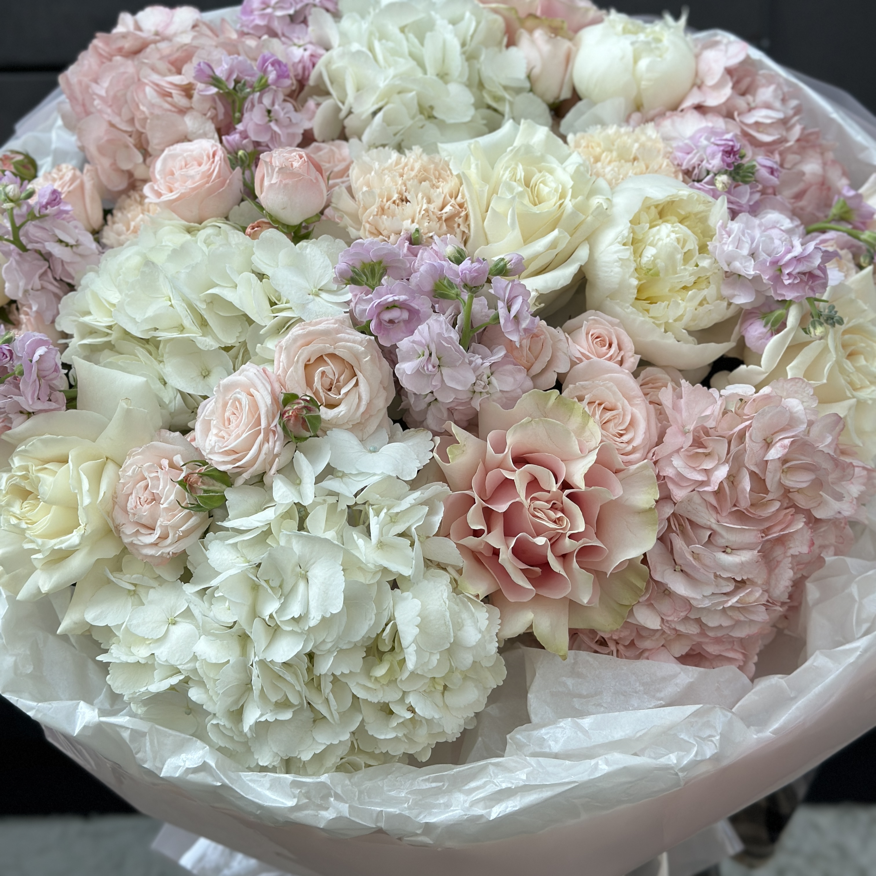 Заказать Авторский букет c маттиолой, гортензией и пионовидными розами с доставкой по Самаре