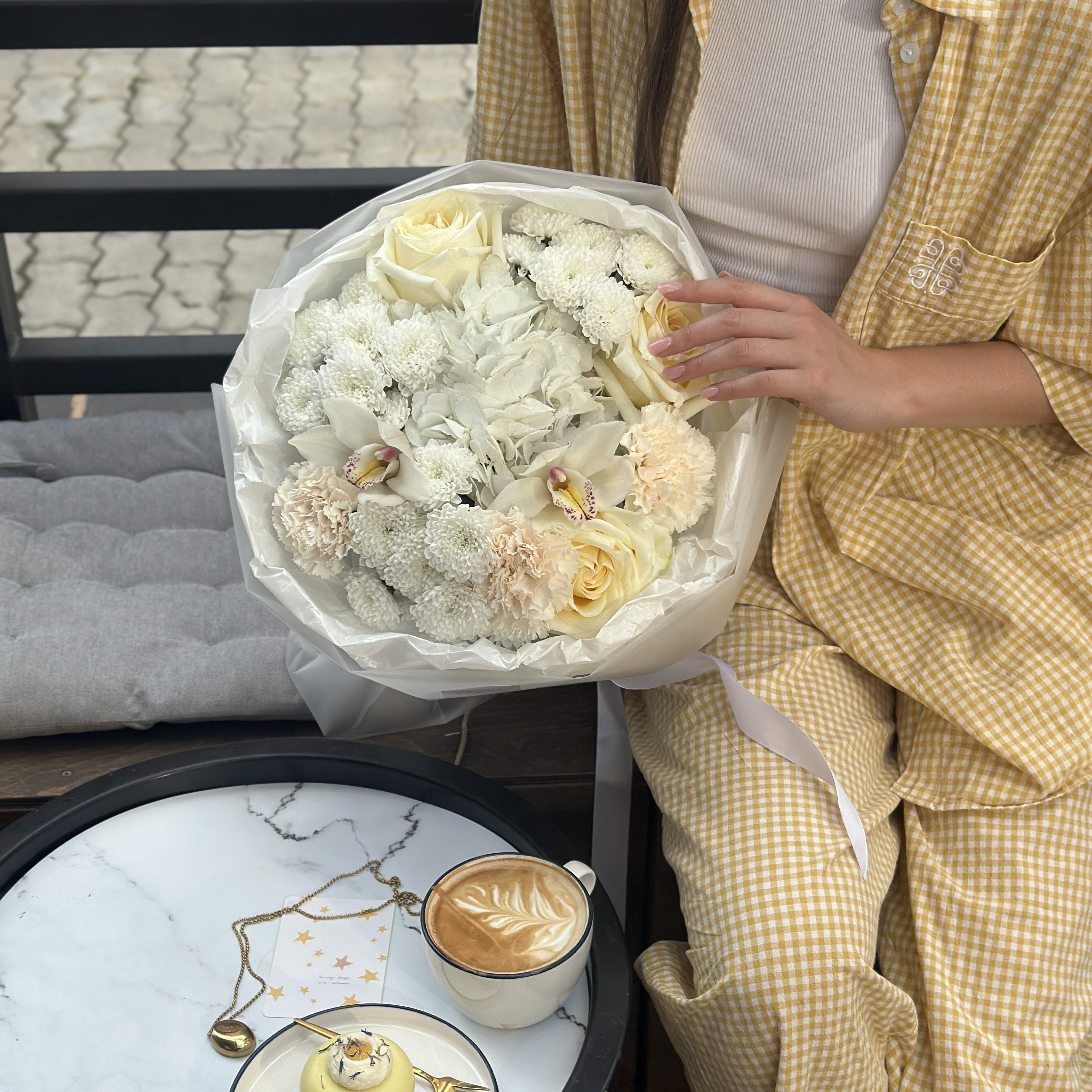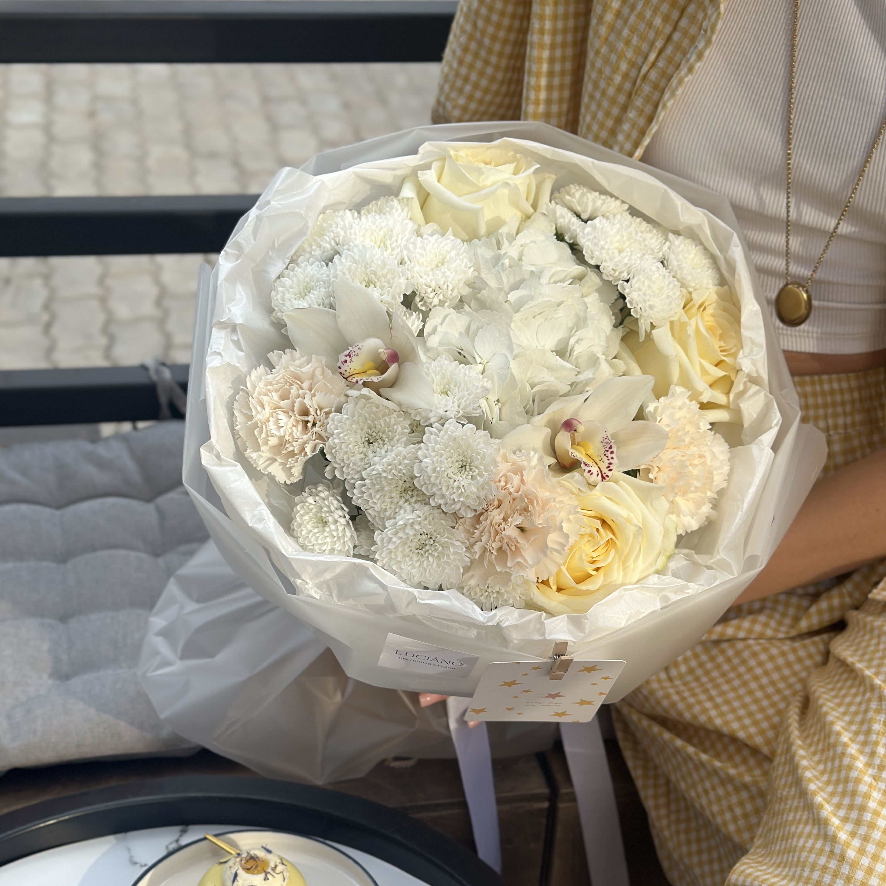 Авторский букет с розами candlelight, сантини, орхидеями и диантусами
