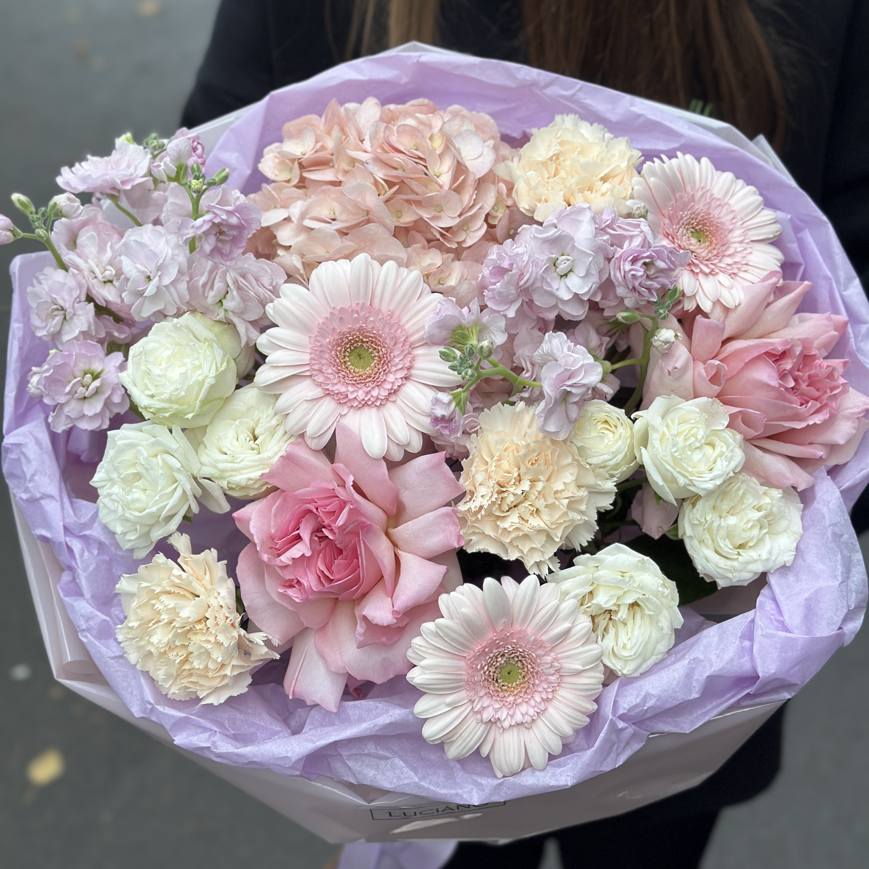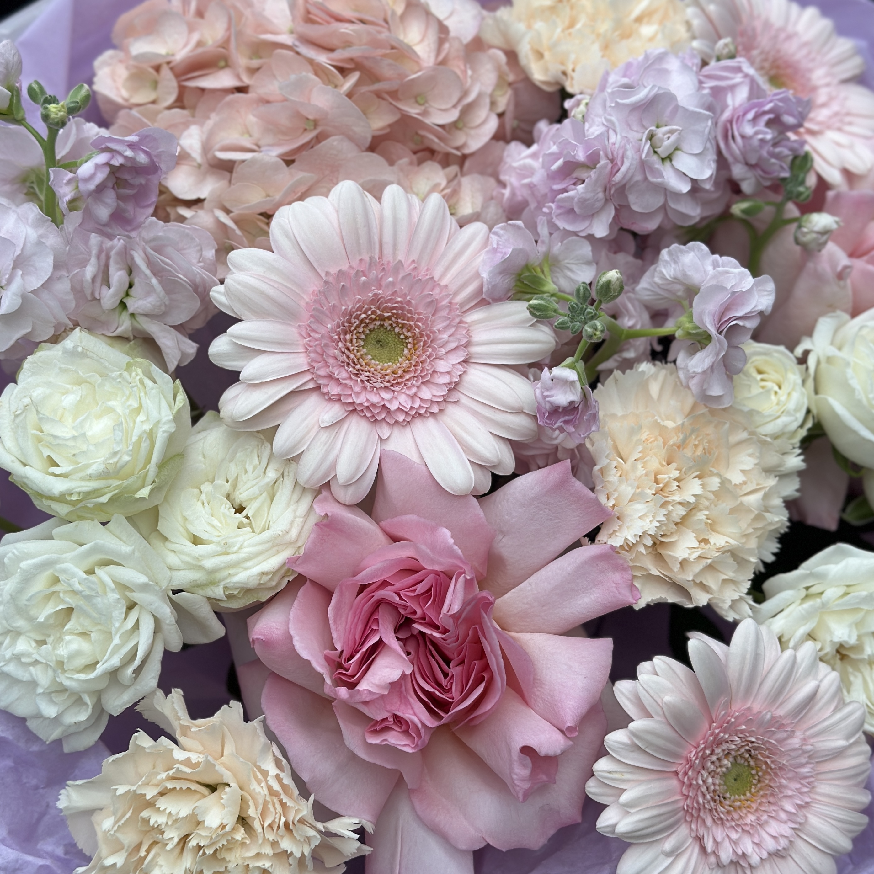 Сборный букет с гермини, кустовыми и французскими розами, диантусами и гортензией