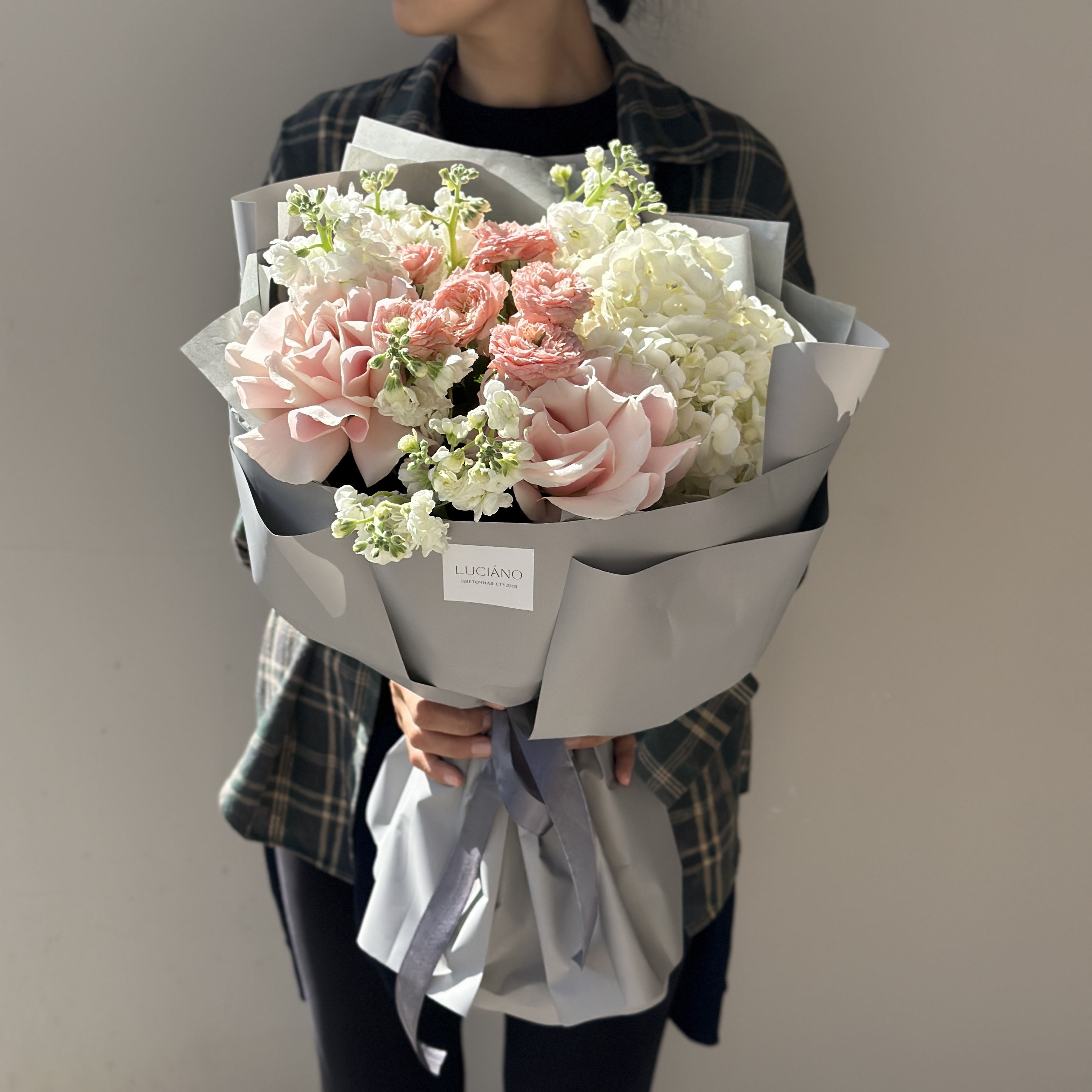 Авторский букет с маттиолой, кустовыми розами и гортензией