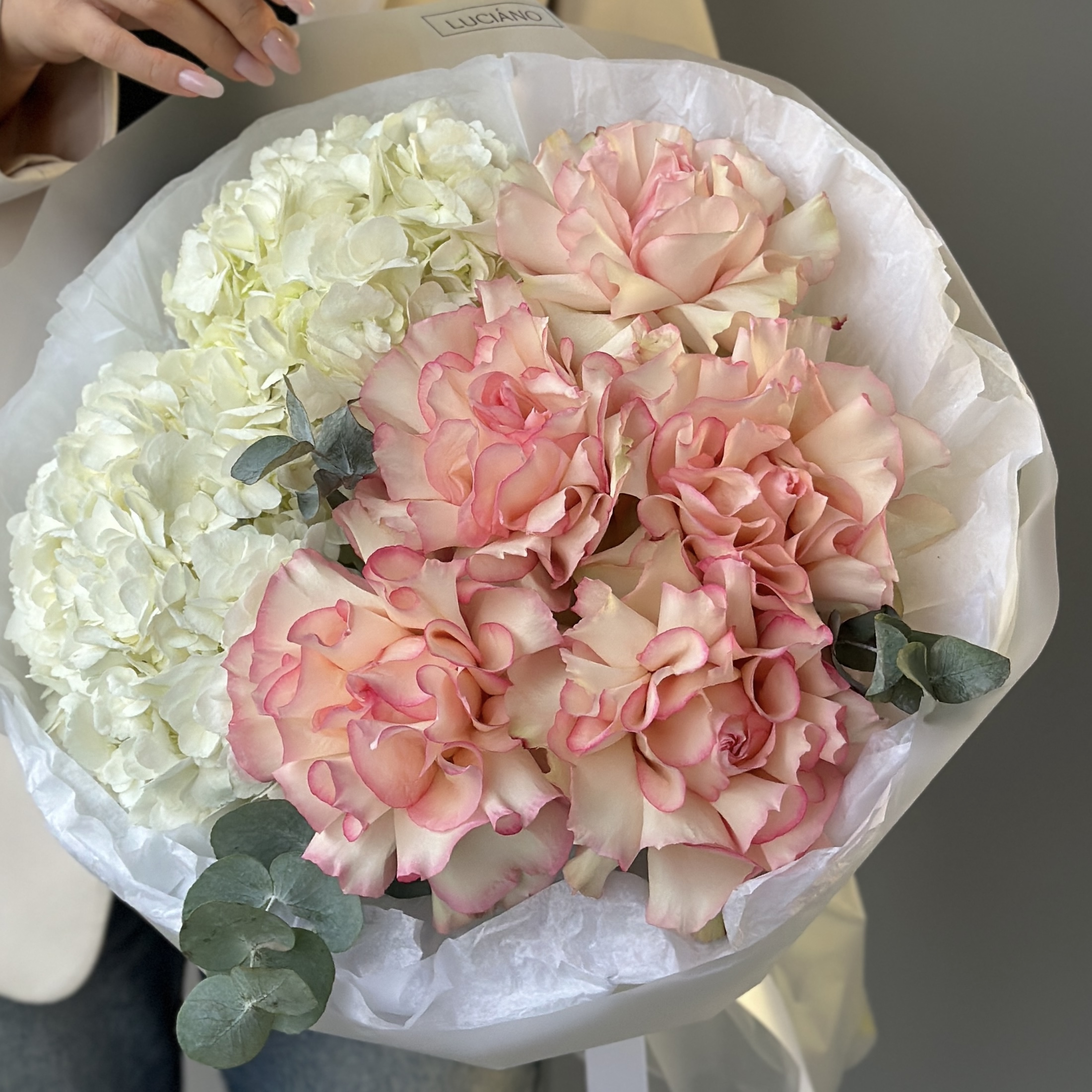 Гортензии, французские розы и эвкалипт