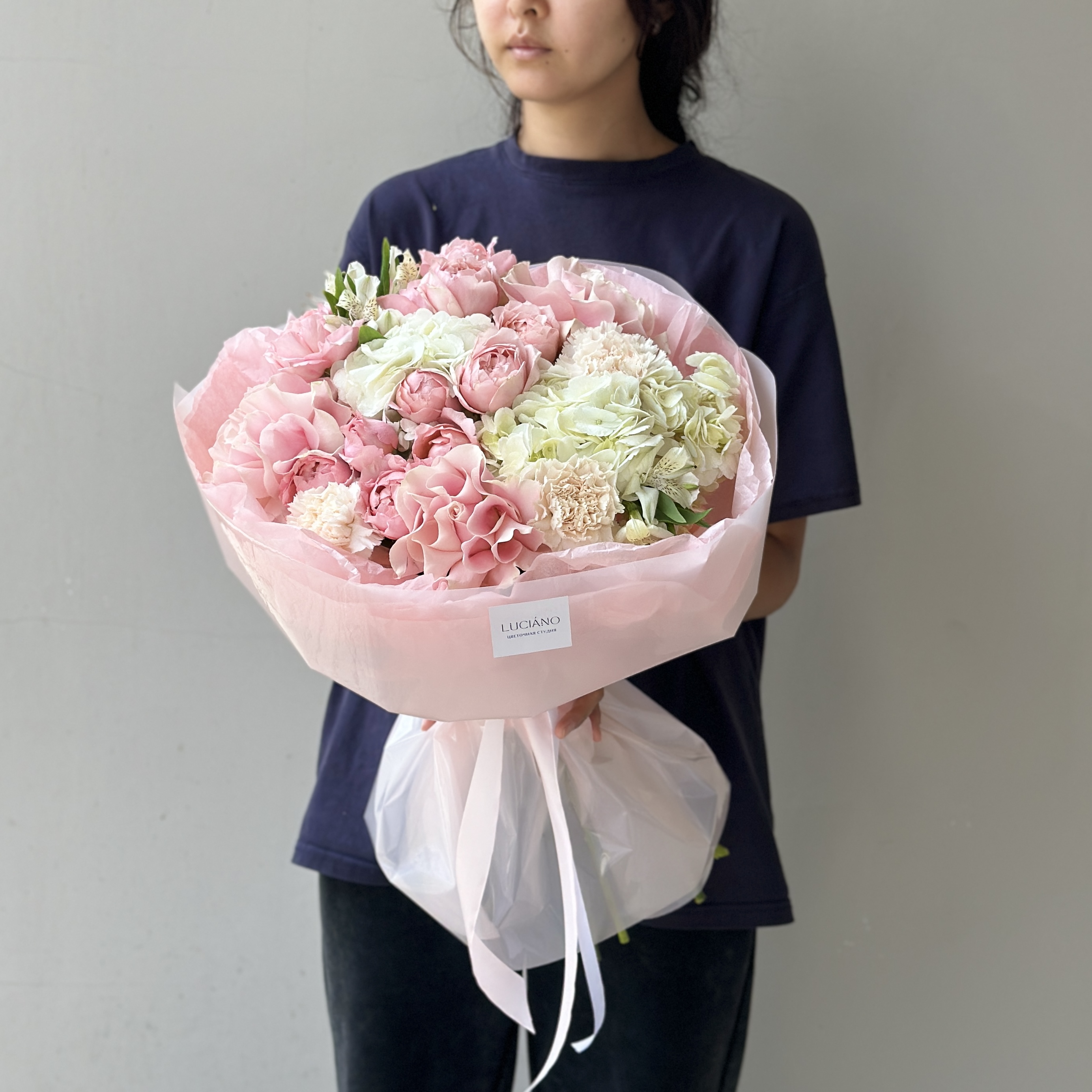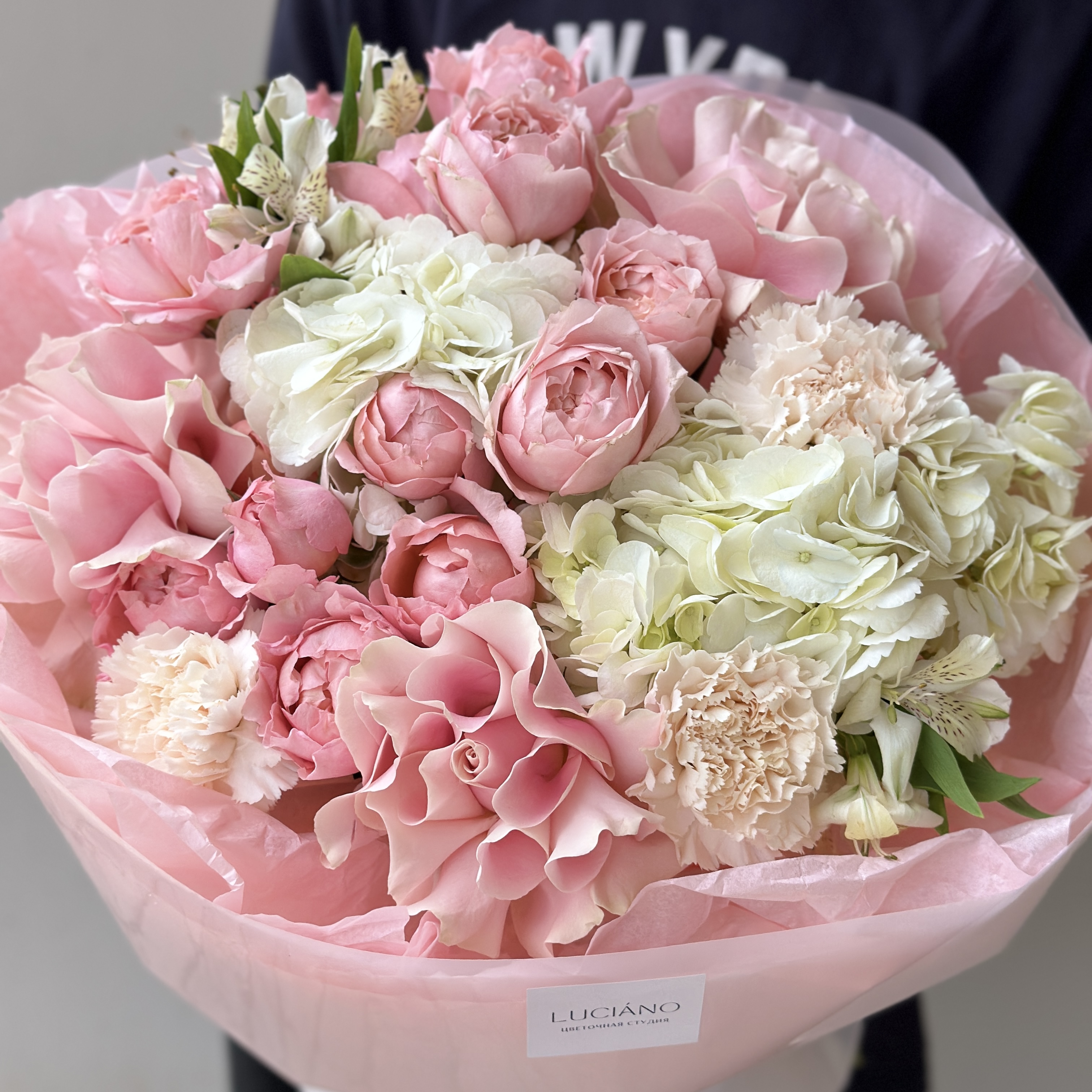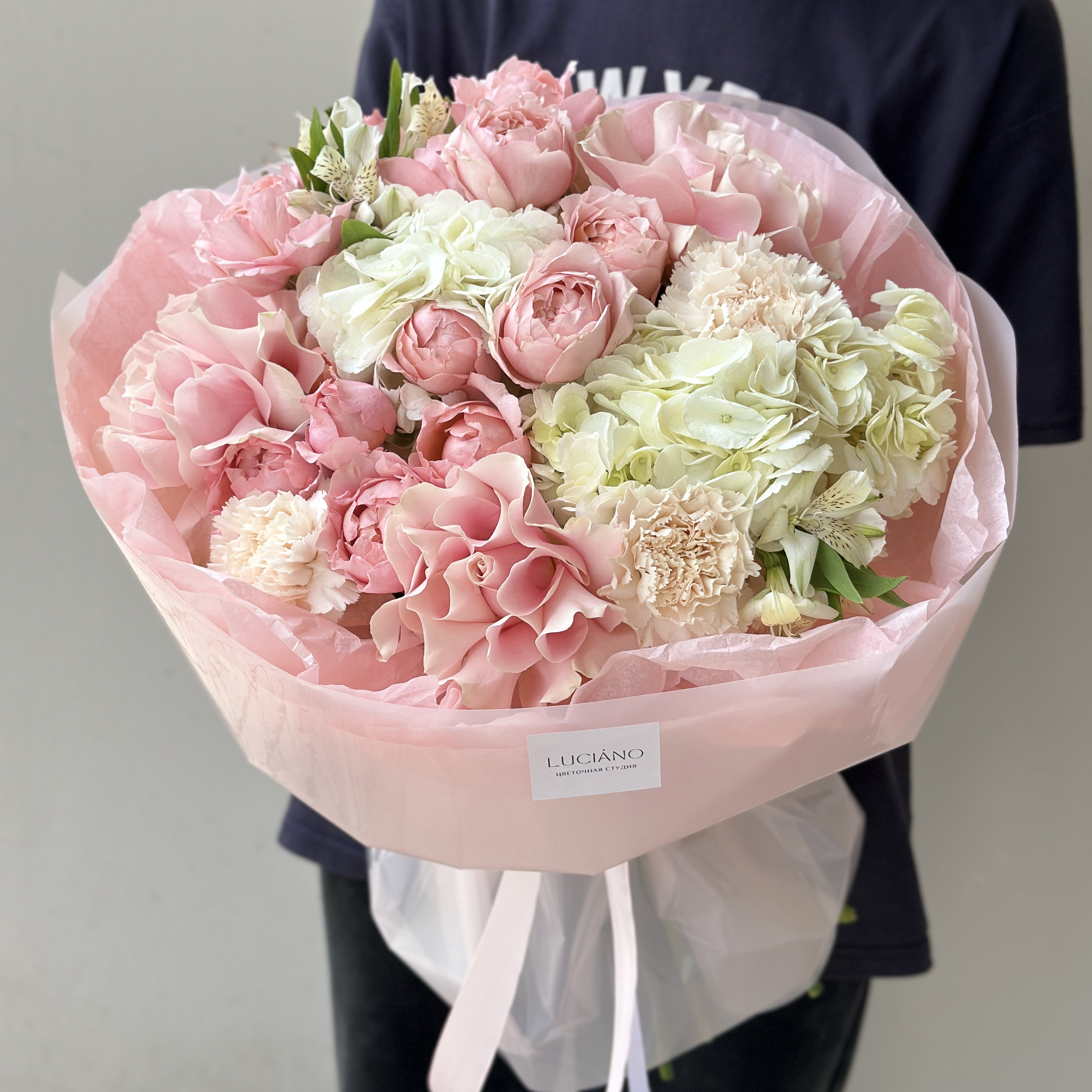 Авторская композиция с сантини, гортензиями и французскими розами Country Blues