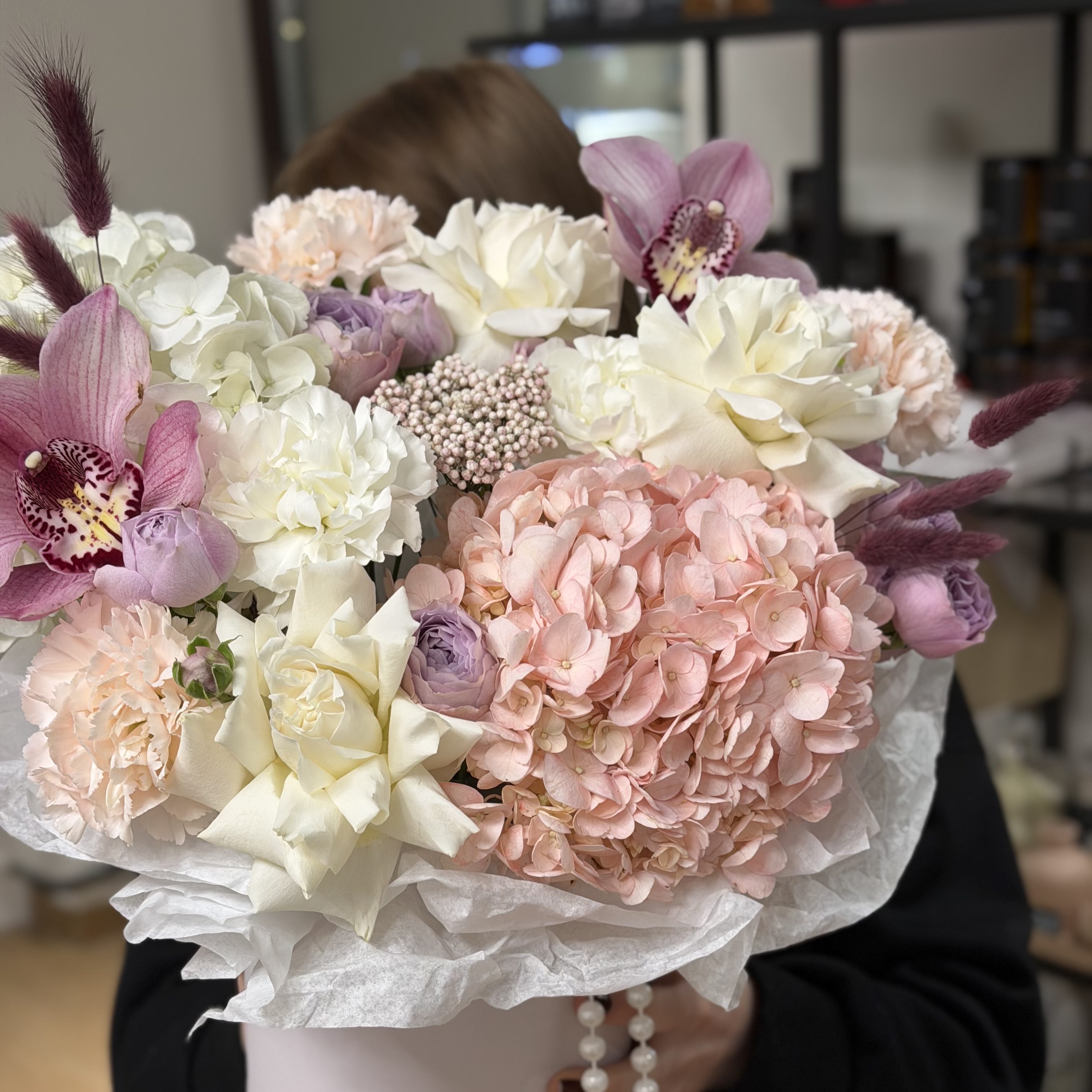 Авторская композиция с лагурусом, французскими розами и гортензиями