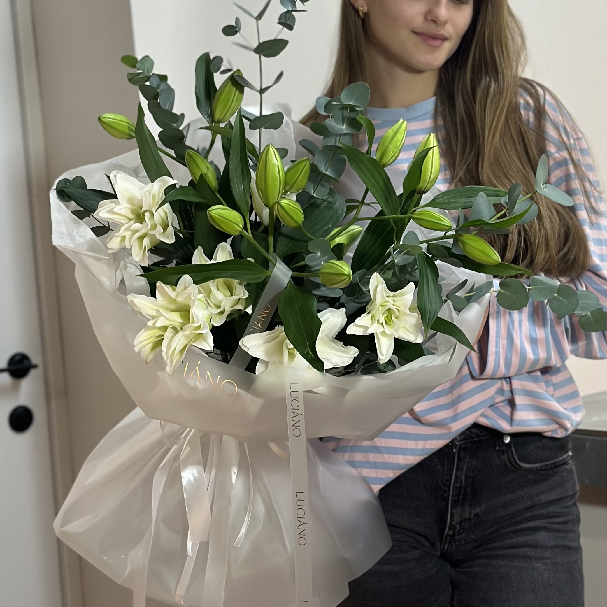 Изысканный моно-букет, где аромат лилий встречаются с ажурной дымкой эвкалипта. Гармония чистоты и изящной простоты.