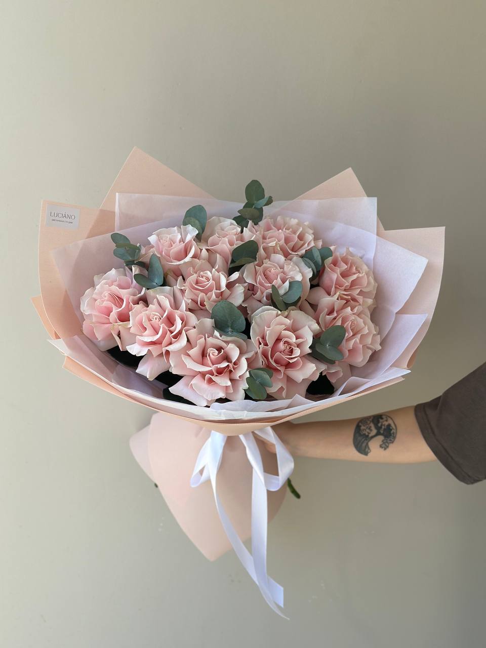 Моно букет из французских роз Pink Mondial - 11 шт с эвкалиптом