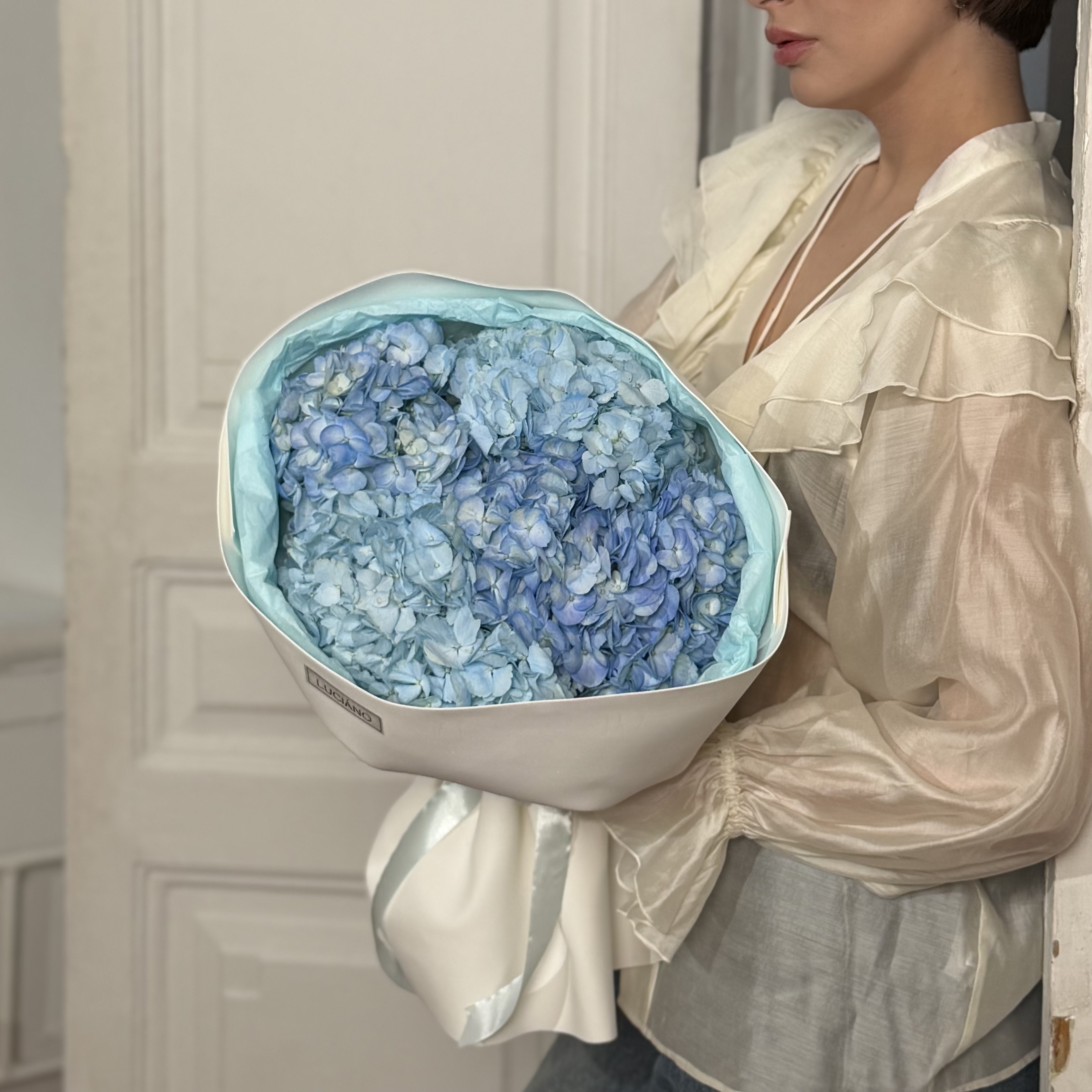 Моно-букет из пяти объемных гортензий. Выразительная текстура и глубина цвета в минималистичном исполнении.