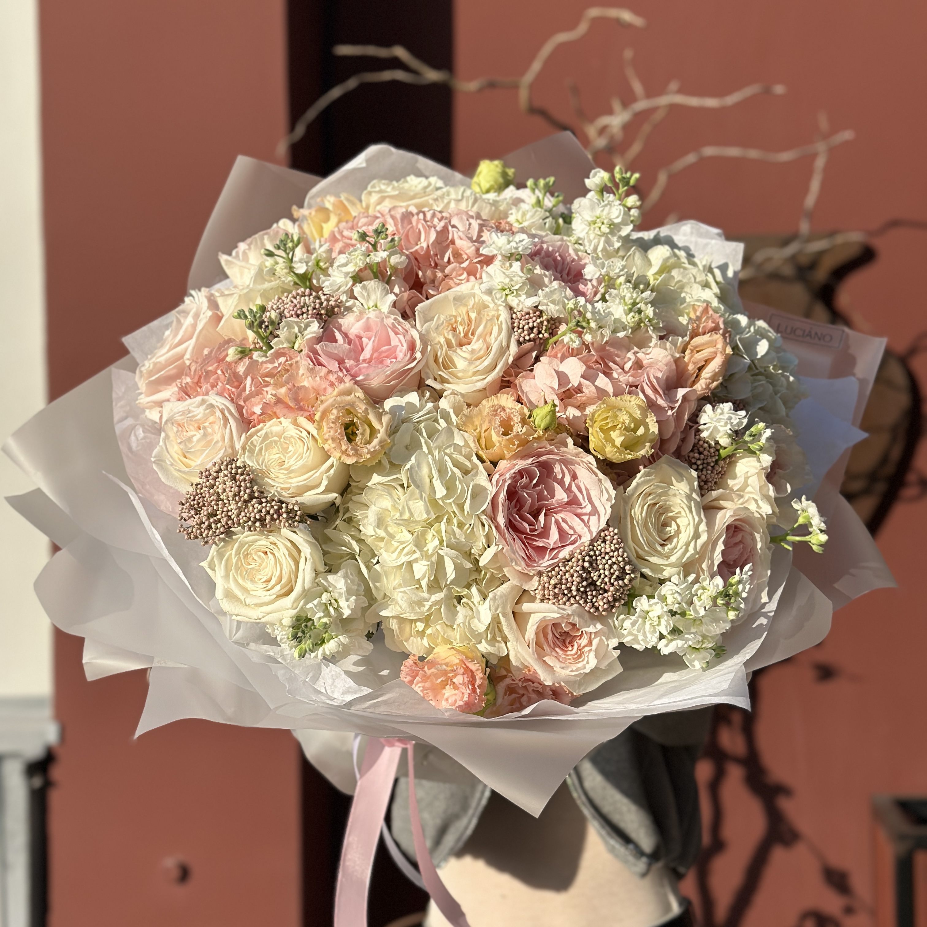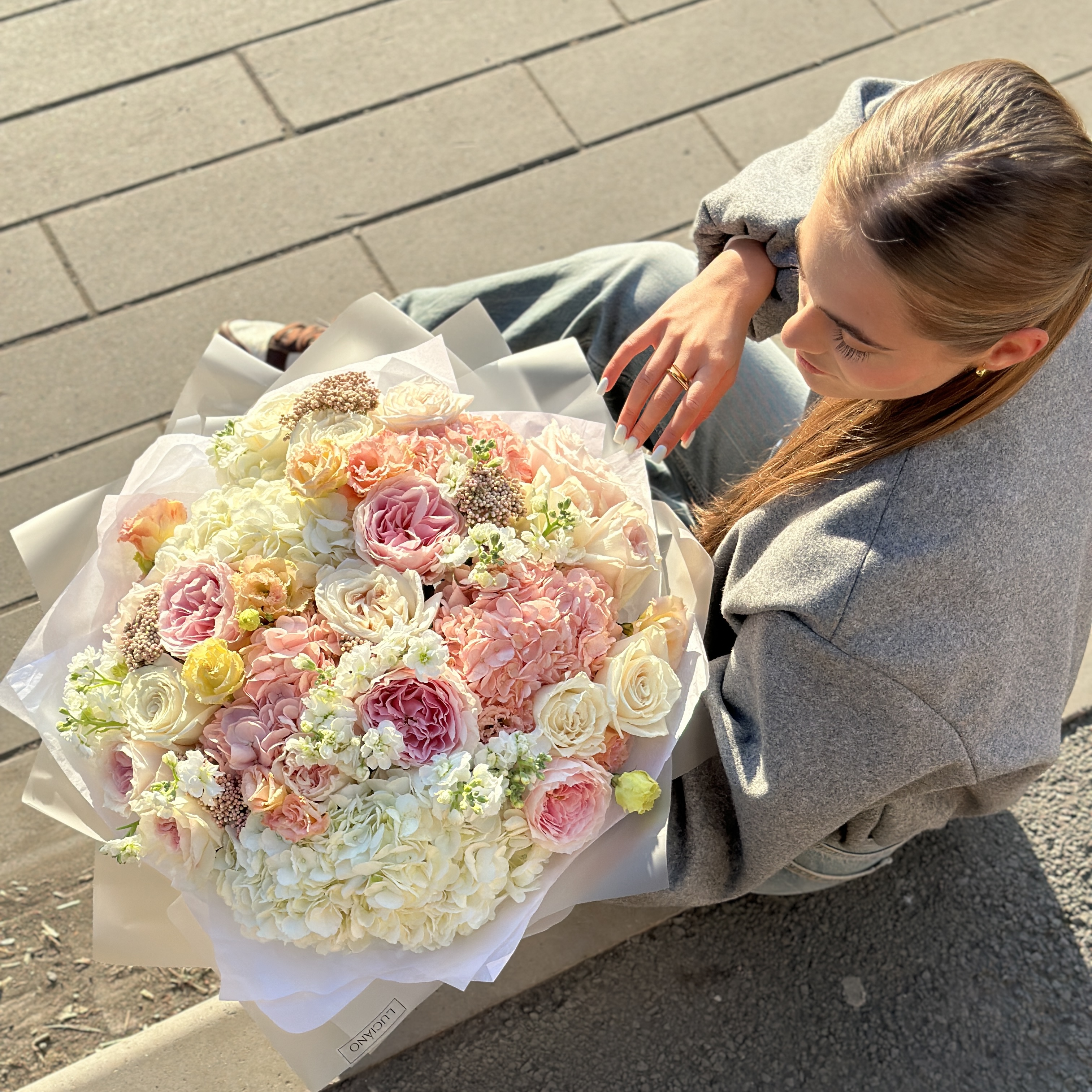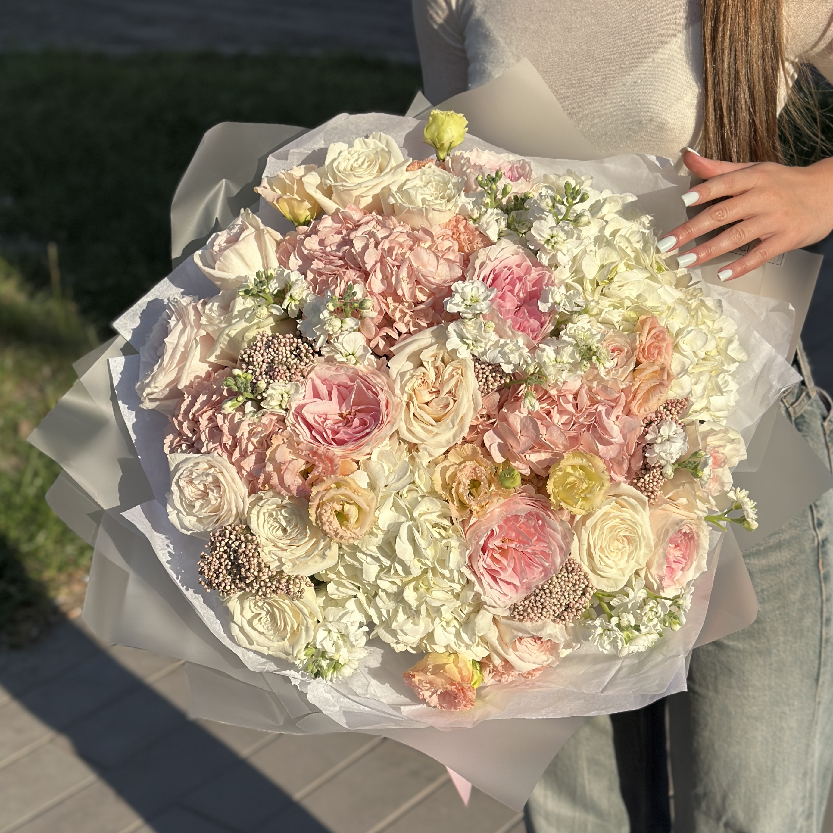Авторский букет с премиальными сортами пионовидных роз, маттиолой, эустомой и гортензиями